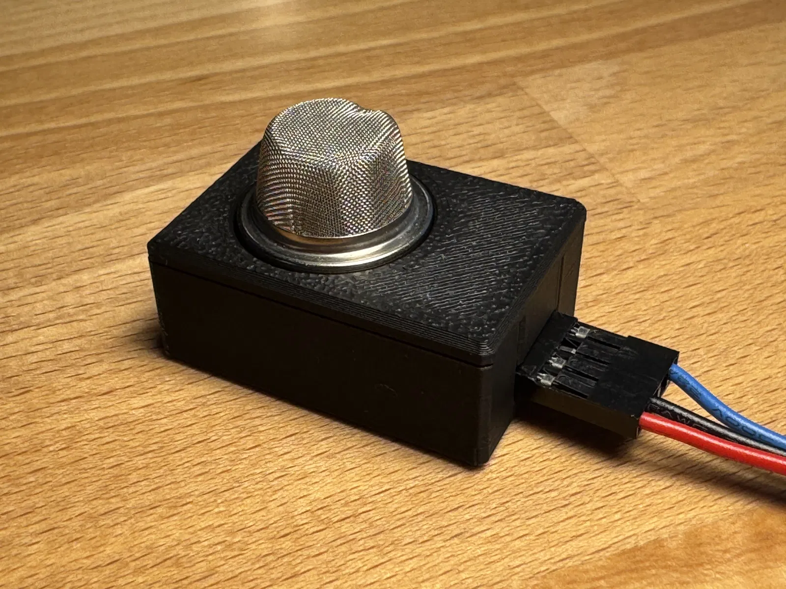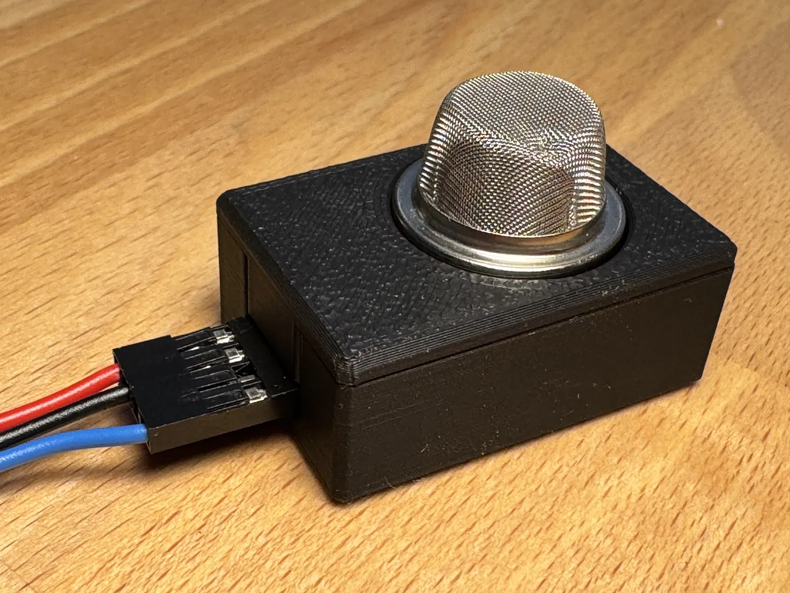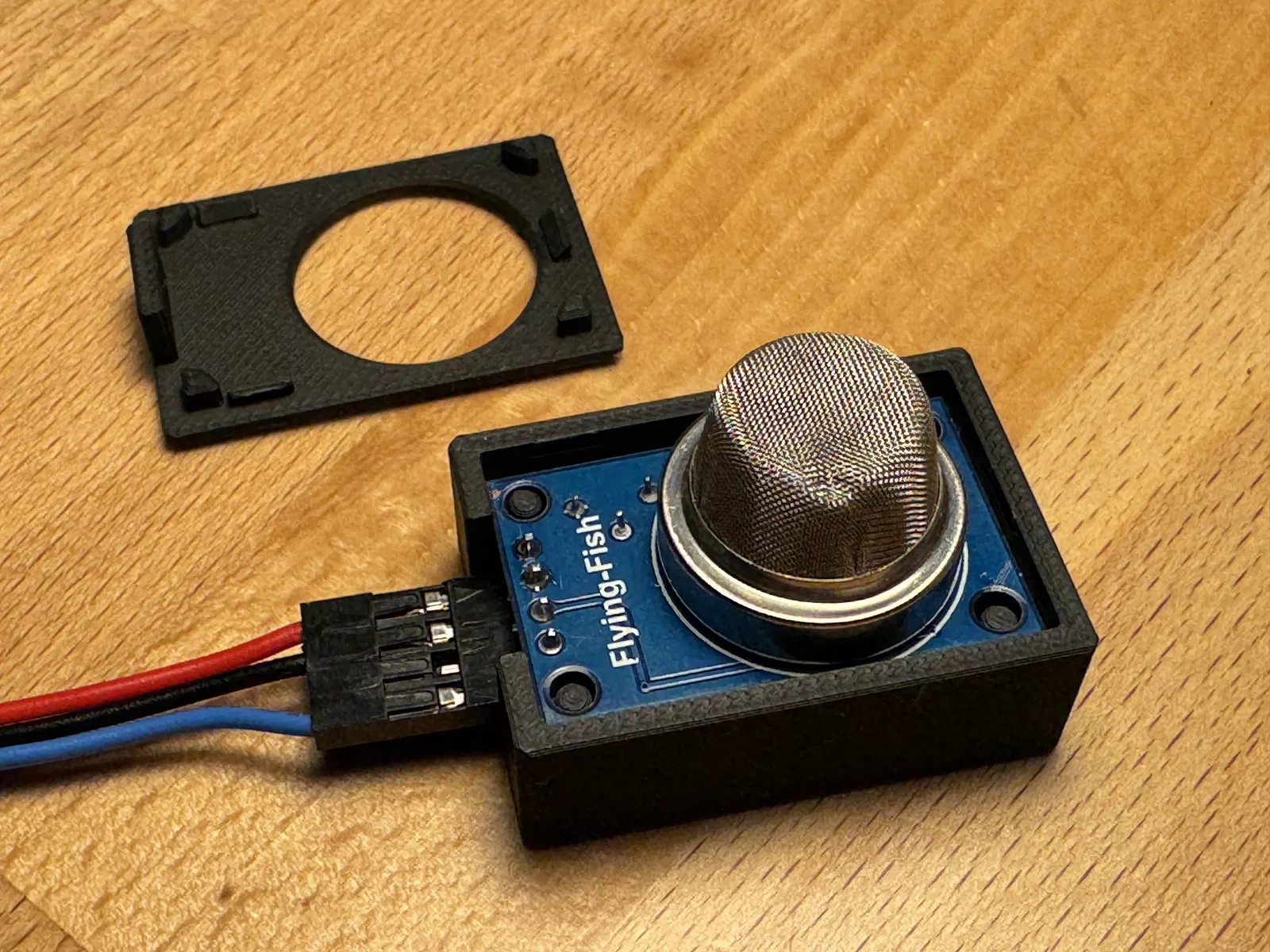 Hộp cảm biến khí dòng MQ với thiết kế ráp nối tiện lợi. Sản phẩm được in thử nghiệm bằng PLA trên máy Bambu với cài đặt tiêu chuẩn, không cần vật liệu hỗ trợ. Các chân VCC, GND, D0, A0 được ghi nhãn rõ ràng ở mặt dưới.