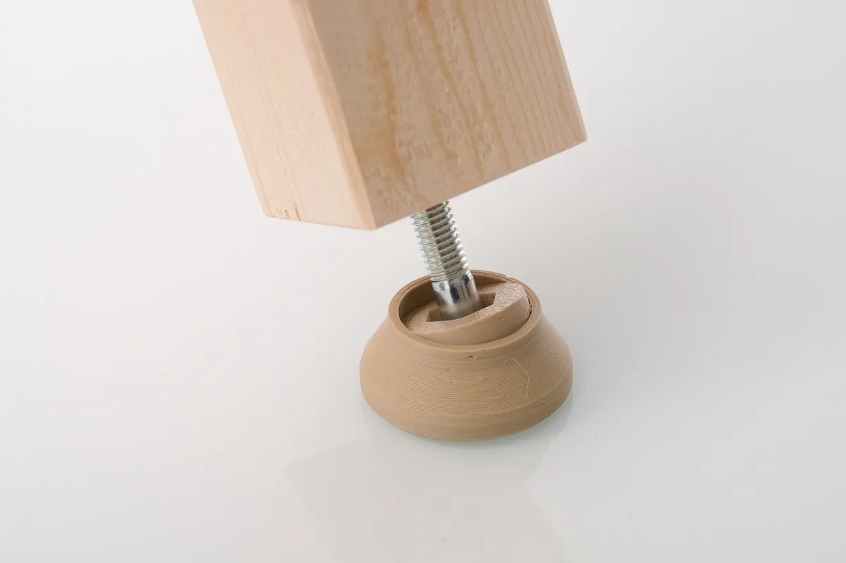 Mẫu chân cân chỉnh này dùng vít M8 và con tán, có file OpenSCAD đi kèm để dễ dàng tùy chỉnh theo nhu cầu. Thích hợp để cân bằng bàn ghế, tủ kệ.