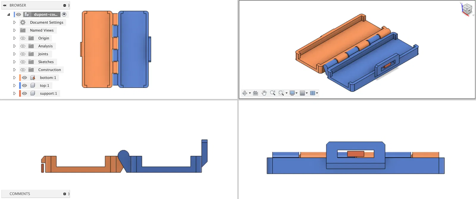 Đây là nắp gập cho đầu nối Dupont 4 chân, giúp chống tuột. Bạn có thể mở, đóng và khóa nắp dễ dàng. Lưu ý tháo bỏ phần hỗ trợ tạm thời sau khi in và cẩn thận với phần khóa vì nó có thể giòn.
