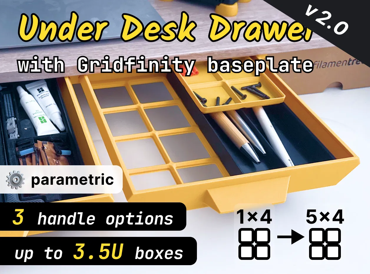 Remix mẫu Ngăn kéo dưới bàn với tấm đế Gridfinity siêu nhẹ, tối ưu hóa chiều cao hộp và dung lượng lưu trữ. Tích hợp liền mạch với các hộp Gridfinity 3U và 3.5U, hỗ trợ kích thước lên tới 4x4x3.