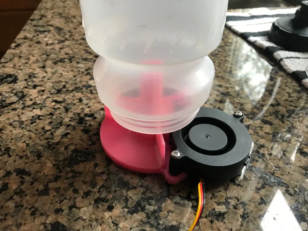Với chai đường kính lớn hơn, có thể đặt chai lệch tâm ra để nó không che mất cái lỗ hút gió của quạt. Tui có thể làm cái cánh đỡ phía đối diện quạt dài hơn để xử lý chai bự hơn theo kiểu lệch tâm. Tui cũng thắc mắc là thổi khí từ bên hông có giúp lưu thông khí tốt hơn không, và sẽ làm khô nhanh hơn nữa. Thiết kế hiện tại thì xài được cho đa số nhu cầu của bọn tui, từ mấy chai nước suối bình thường tới mấy chai nước xe đạp luôn.