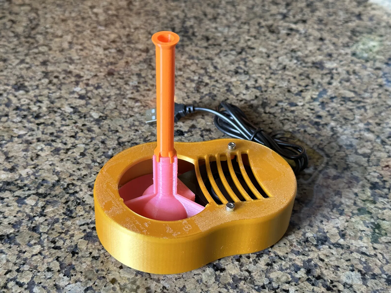 Bọn tui hay xài lại mấy cái chai nước ngọt của Ý, nên phải rửa chúng nó hoài. Miệng chai nhỏ xíu, đường kính trong chỉ nhỉnh hơn 16mm chút thôi – nên tui có thấy cái máy sấy chai có quạt của anh alexthurlow (powered bottle dryer) và chuẩn bị in liền thì mới nhận ra cái đường kính ngoài của cái vòi là 25mm – bự quá không nhét vô chai được. Tui thích thiết kế đồ bằng Fusion 360, nên tui lấy cái thiết kế của ổng làm cảm hứng để tự tui làm từ đầu. Tui để ý thấy với cái bề mặt ngoài trơn tuột của cái vòi, nếu nó bằng với đường kính trong của chai, thì không khí không có đường thoát ra, nên tui sửa lại thiết kế của tui cho có đường cho khí thoát. Tui cũng nhận ra là nếu để cái quạt xa hơn thì sẽ có một vùng dài cần phải làm bridging hoặc xài support, nên tui thiết kế lại với cái quạt nằm sát vô hơn để giảm thiểu vùng này. Tui cũng làm cái chuyển tiếp từ miệng quạt ra cái vòi tròn bằng cách loft để hy vọng giảm tổn thất luồng khí. Với hiện trạng, dùng nguồn 8.5V cho quạt (tưởng đâu lấy lộn cục 12V), luồng khí thổi ra mạnh kinh khủng. Trong một lần thử với chai miệng bự hơn (khoảng 40mm đường kính trong) thì chai khô cong trong khoảng 15-20 phút.