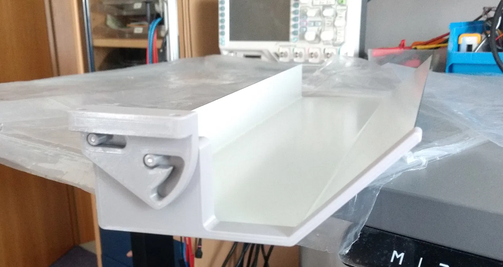 Các giá đỡ chỉ cần gắn vào tấm kim loại. Tấm kim loại là thép mạ kẽm 1.0 mm và có thể đặt mua trực tuyến theo kích thước với giá rẻ :-). Tôi đã đặt làm tấm kim loại tại https://bleche-nach-mass.de/ .