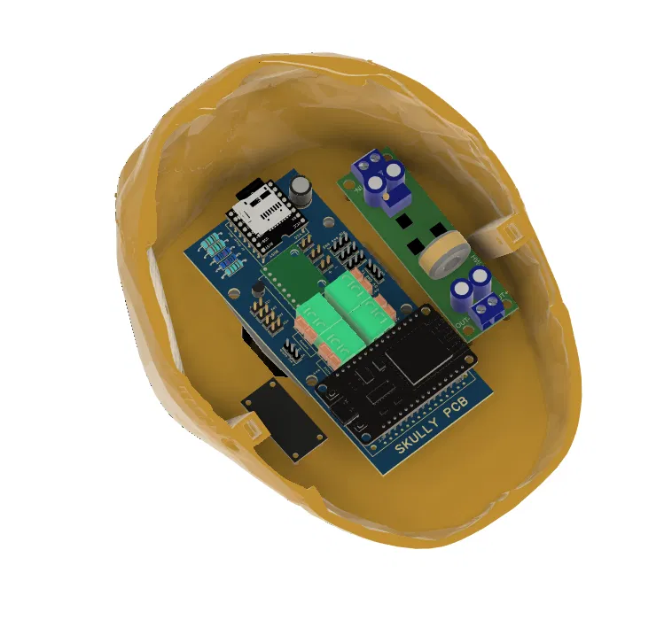 Skully dùng vi điều khiển ESP32 và ESPCam để phối hợp chuyển động mắt, có phát âm thanh, và sử dụng các đầu vào vị trí để phản hồi tương tác. Hàm của Skully chuyển động theo lời nói, và ổng có khả năng theo dõi mắt sơ đẳng. Để làm Skully, bạn sẽ cần máy in 3D và mỏ hàn. Tổng chi phí linh kiện, kể cả dây in 3D, vào khoảng 130 bảng Anh. Tất cả các file đều có sẵn ở đây, từ file in 3D, danh sách vật liệu cho đến code.