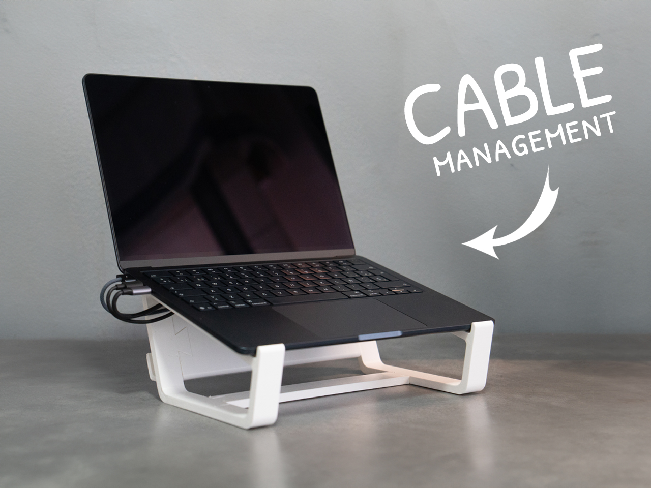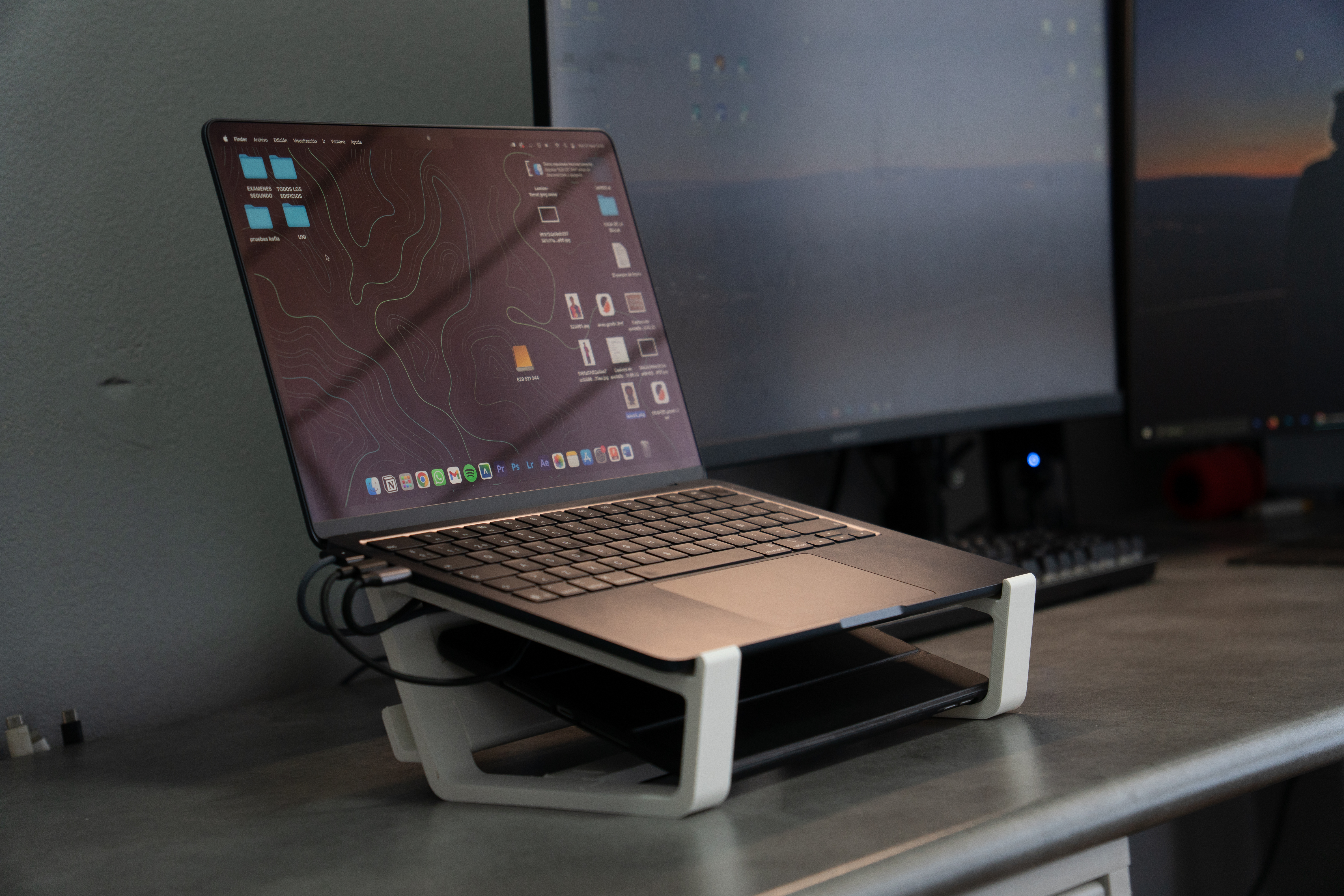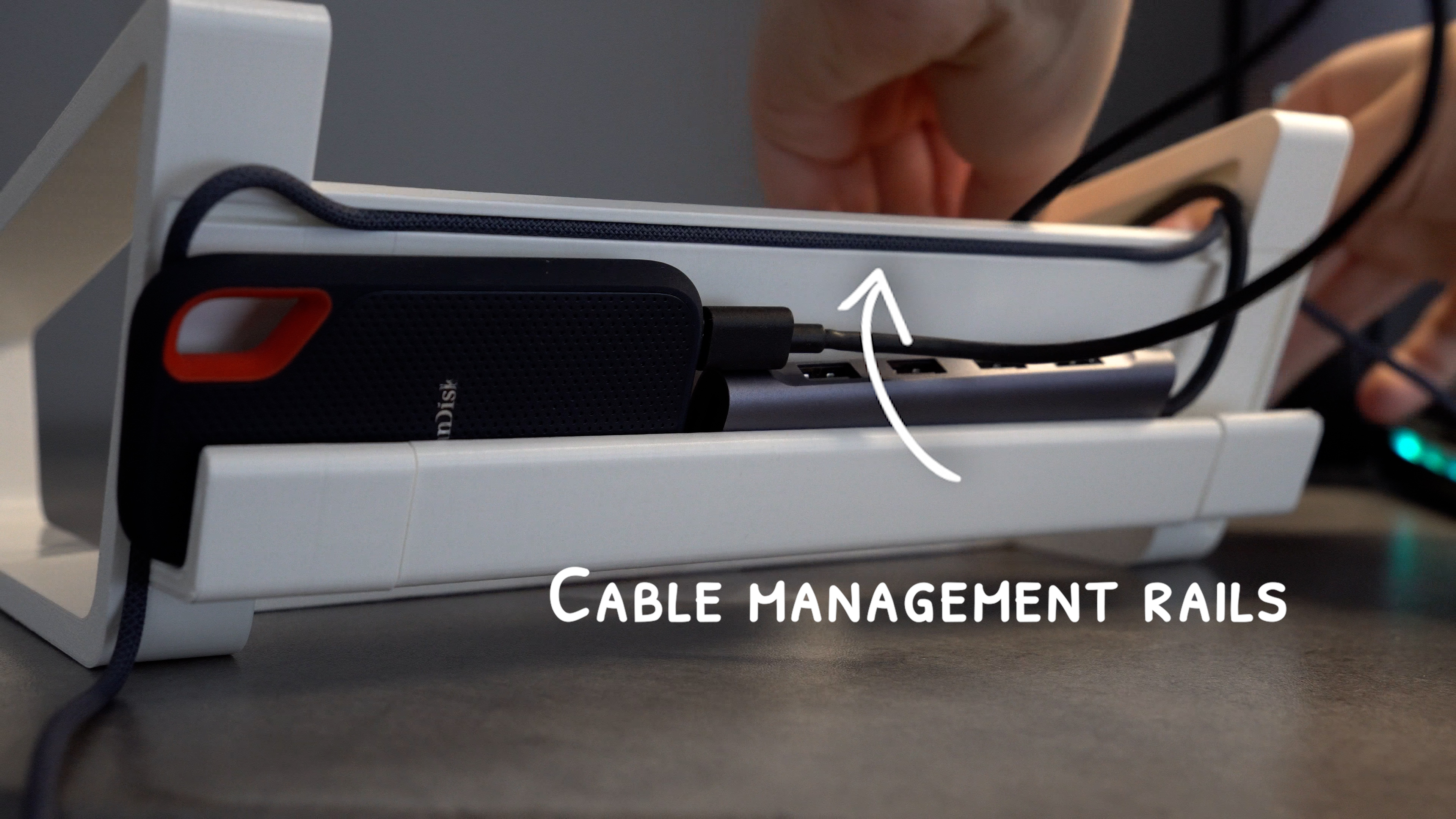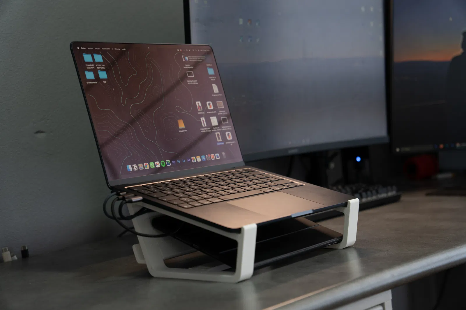 Tao thiết kế cái stand laptop tối giản này nè, có khoang phía sau để quản lý dây cáp 🔌, rãnh cho dây sạc 🔋. Tao còn để ổ cứng với USB-C hub 🔗 phía sau để nối laptop với màn hình 🖥. Mọi người thấy sao? 🤔👀