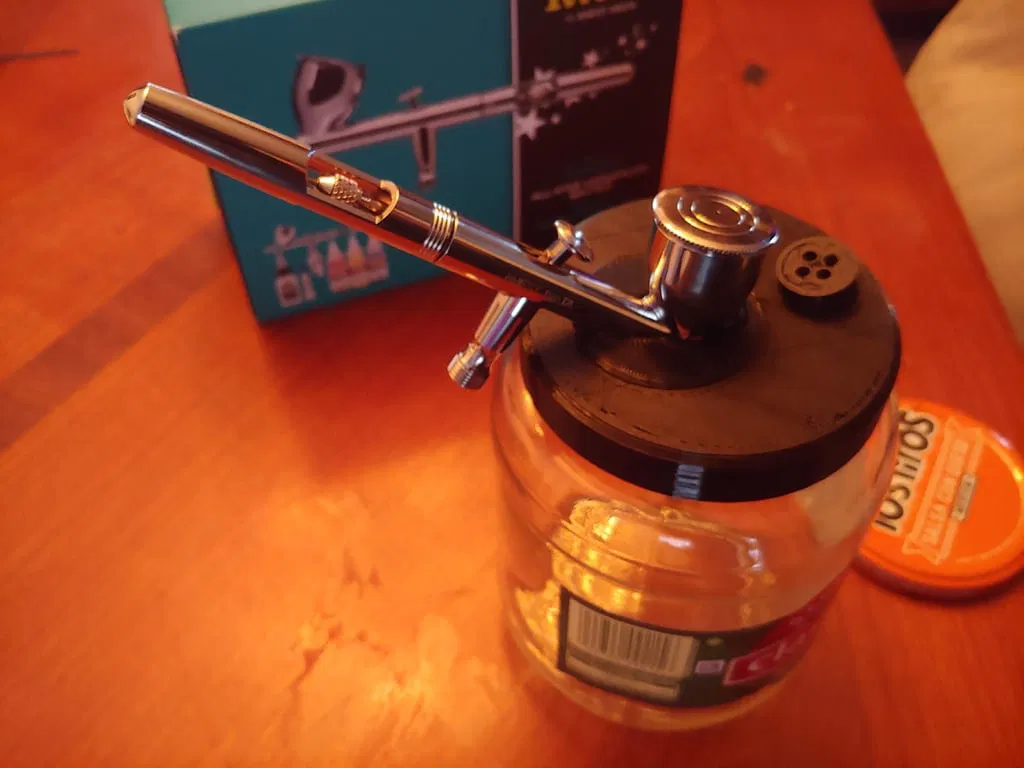 Mới sắm được cây Iwata mới hồi sinh nhật. Mình tìm mãi trên mạng mà không thấy cái hũ rửa cọ nào ưng ý nên tự chế một cái.