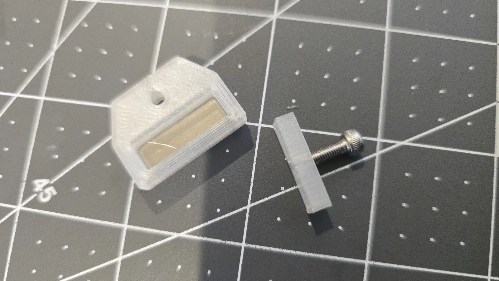 Giá đỡ nam châm cửa được thiết kế lại với nam châm đặt gần hơn để tăng lực giữ. Bản in úp mặt xuống với supports cho hoa văn đẹp. Nắp lưng có lỗ M3 để dễ dàng tháo ra. Hướng dẫn cách lấy nam châm cũ bằng đèn khò và kìm.