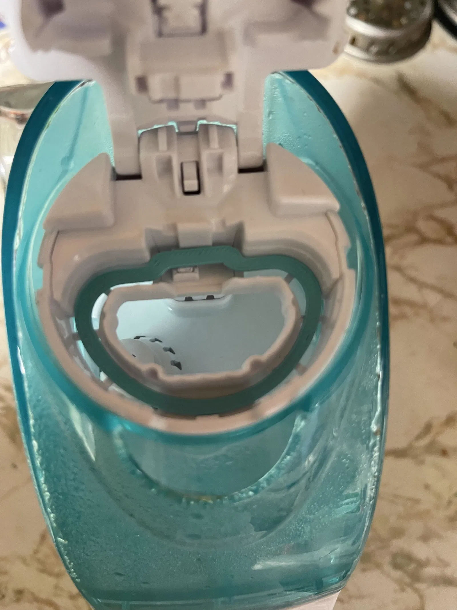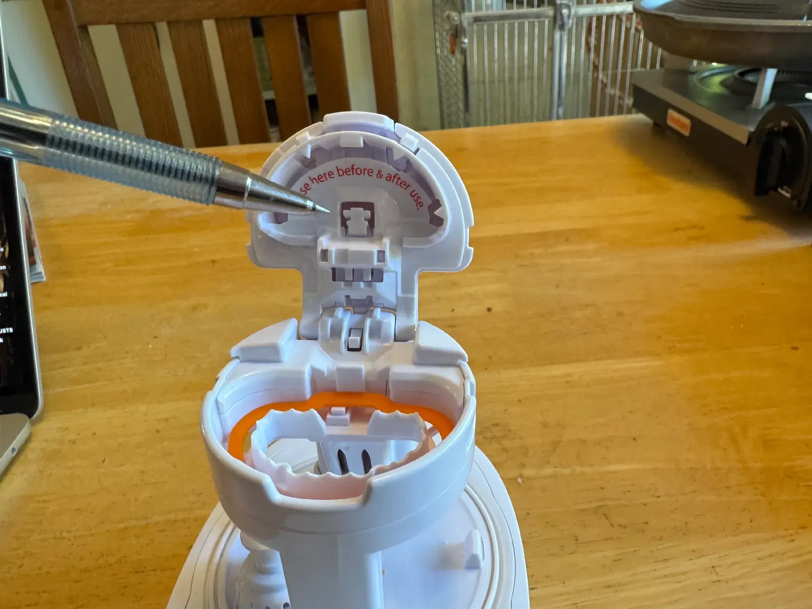 Edit: Bạn AHOLUB ở dưới có đăng cái hình và hướng dẫn rõ ràng hơn về cách làm cho cái này chạy đúng, bạn đóng nắp lại khoảng ¾ đường, thò tay vô rồi ấn cái lúm trên nắp vô. Nó sẽ kêu "cộp" và máy sẽ chạy khi đóng hẳn lại. Tui xin cái hình của bạn ấy về để vô mô tả luôn.
