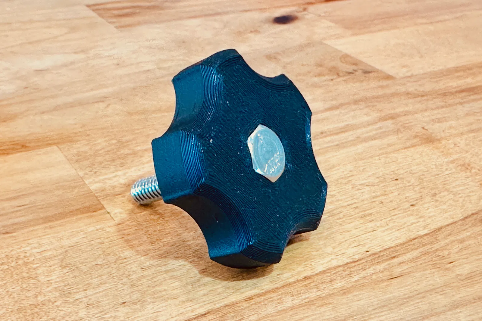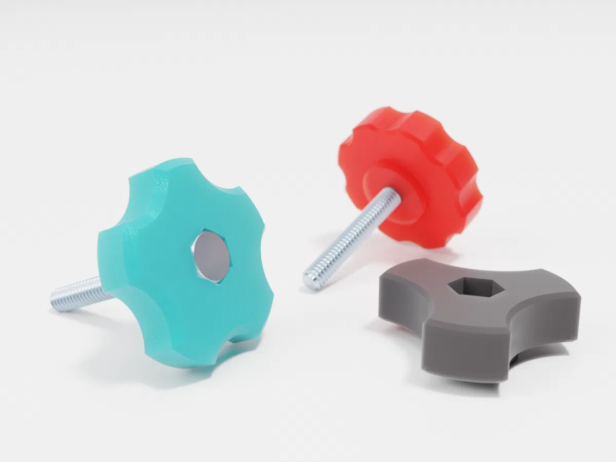 File OpenSCAD/Fusion 360 tùy chỉnh cho phép tạo núm xoay tham số, hỗ trợ bu lông đầu lục giác hoặc đai ốc, với cả hệ mét và hệ inch. Tùy chỉnh hốc âm, cánh, vát cạnh. In không cần hỗ trợ.