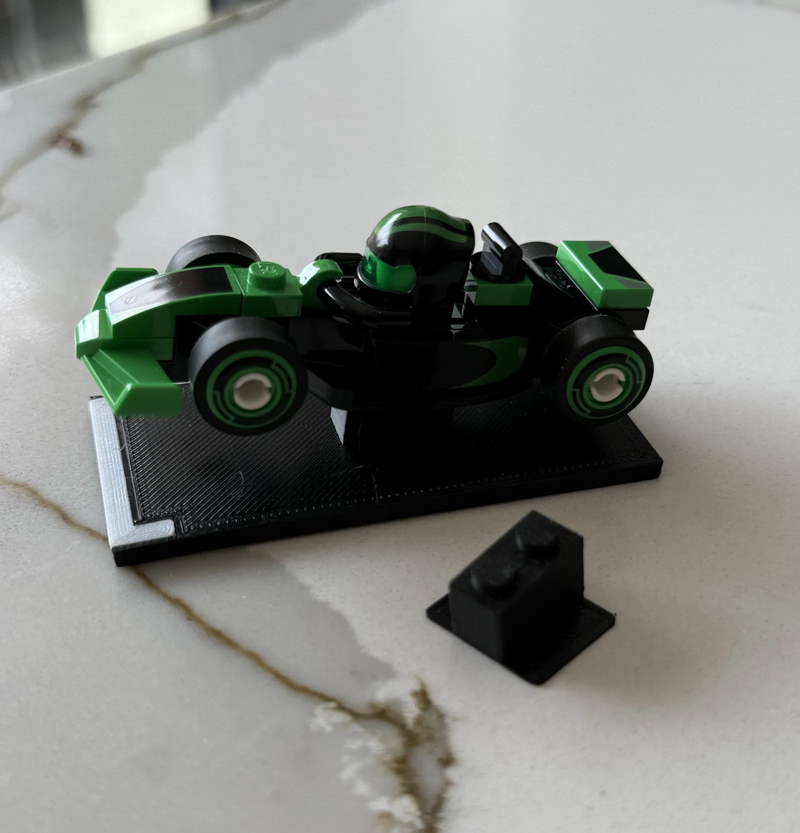 Các tùy chọn gắn đa dạng cho minifig xe F1 Lego. Bộ đầy đủ gồm 12 đế gắn, có các phiên bản để bàn, sắp xếp linh hoạt hoặc gắn khung.