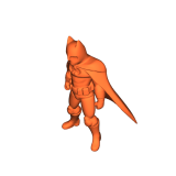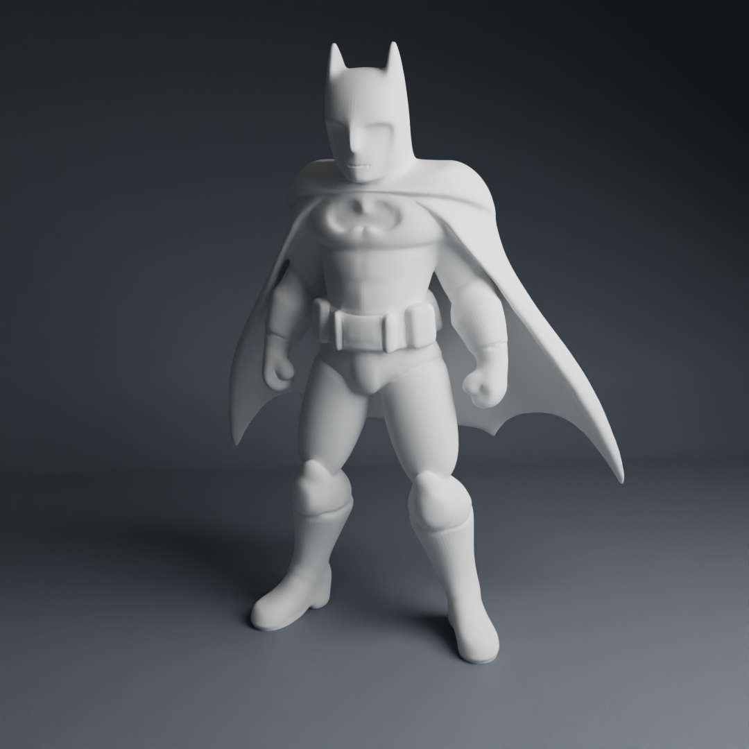Mô hình Batman cách điệu, nhỏ nhắn và đáng yêu. Ảnh render trắng cho thấy bản 3D có thể tải về, còn ảnh màu chỉ là gợi ý phối màu. Sản phẩm một phần AI, lý tưởng cho người thích tô màu và thêm chi tiết.