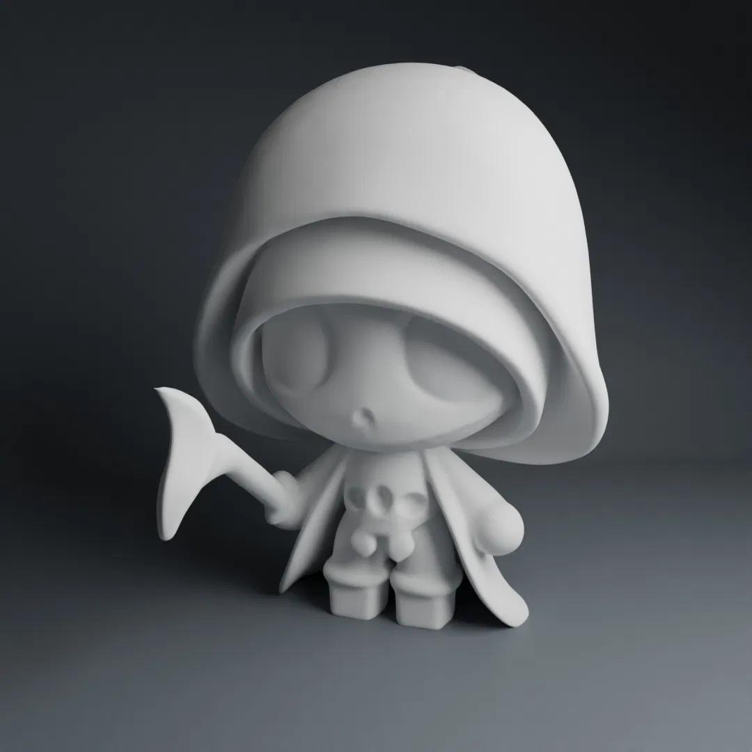 Một mẫu thần chết cách điệu, vừa dễ thương vừa rùng rợn. Ảnh render màu trắng là 3D model, ảnh có màu là gợi ý tô màu. Một phần được tạo bởi AI, nên chi tiết có thể khác biệt so với ảnh gợi ý tô màu.