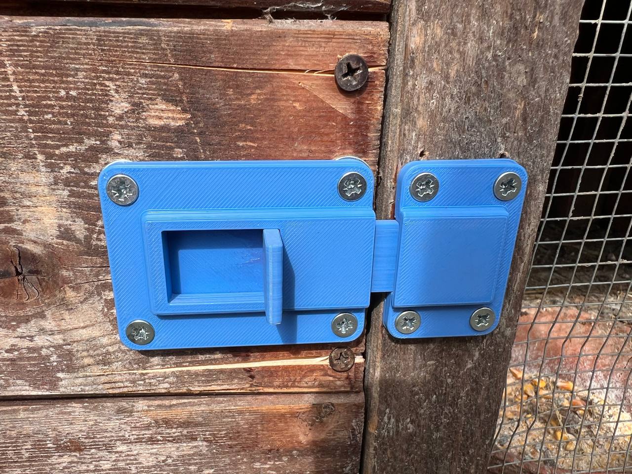 Chốt cửa tui tự làm cho chuồng gà. Chốt trượt cực kỳ đơn giản, dễ in và lắp ráp. Để lắp đặt, bạn cần tám con vít gỗ 4mm và một ít dầu bôi trơn cho hoạt động trơn tru hơn. Để in chốt, tui đề xuất dùng PETG, ABS hoặc ASA cho mục đích sử dụng ngoài trời.