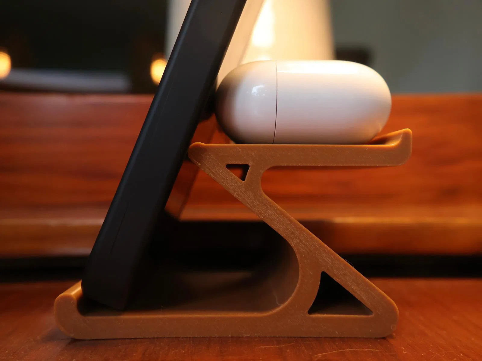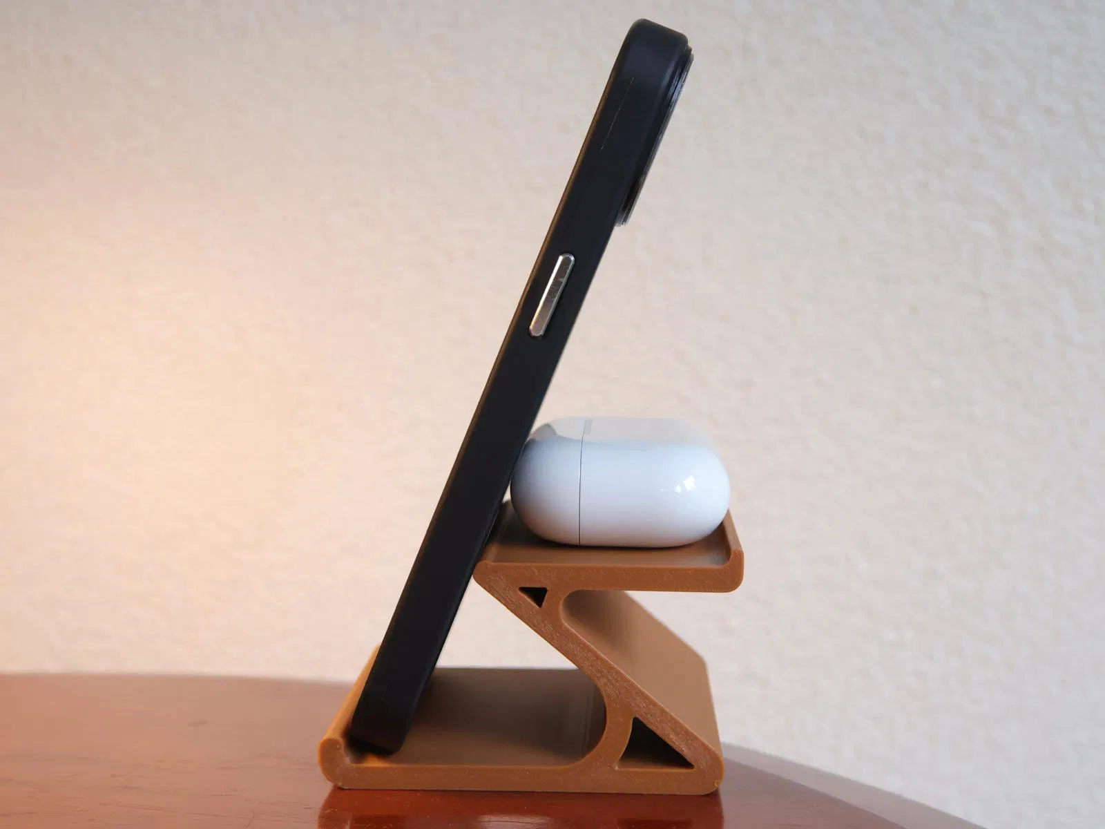 Chân đế điện thoại tối giản, tiện dụng, có chỗ để Airpods hoặc tai nghe không dây khác. Thiết kế gọn gàng, chắc chắn, lý tưởng để xem video, sạc điện thoại, giữ bàn làm việc gọn gàng. In bằng PLA hoặc PETG, không cần hỗ trợ.