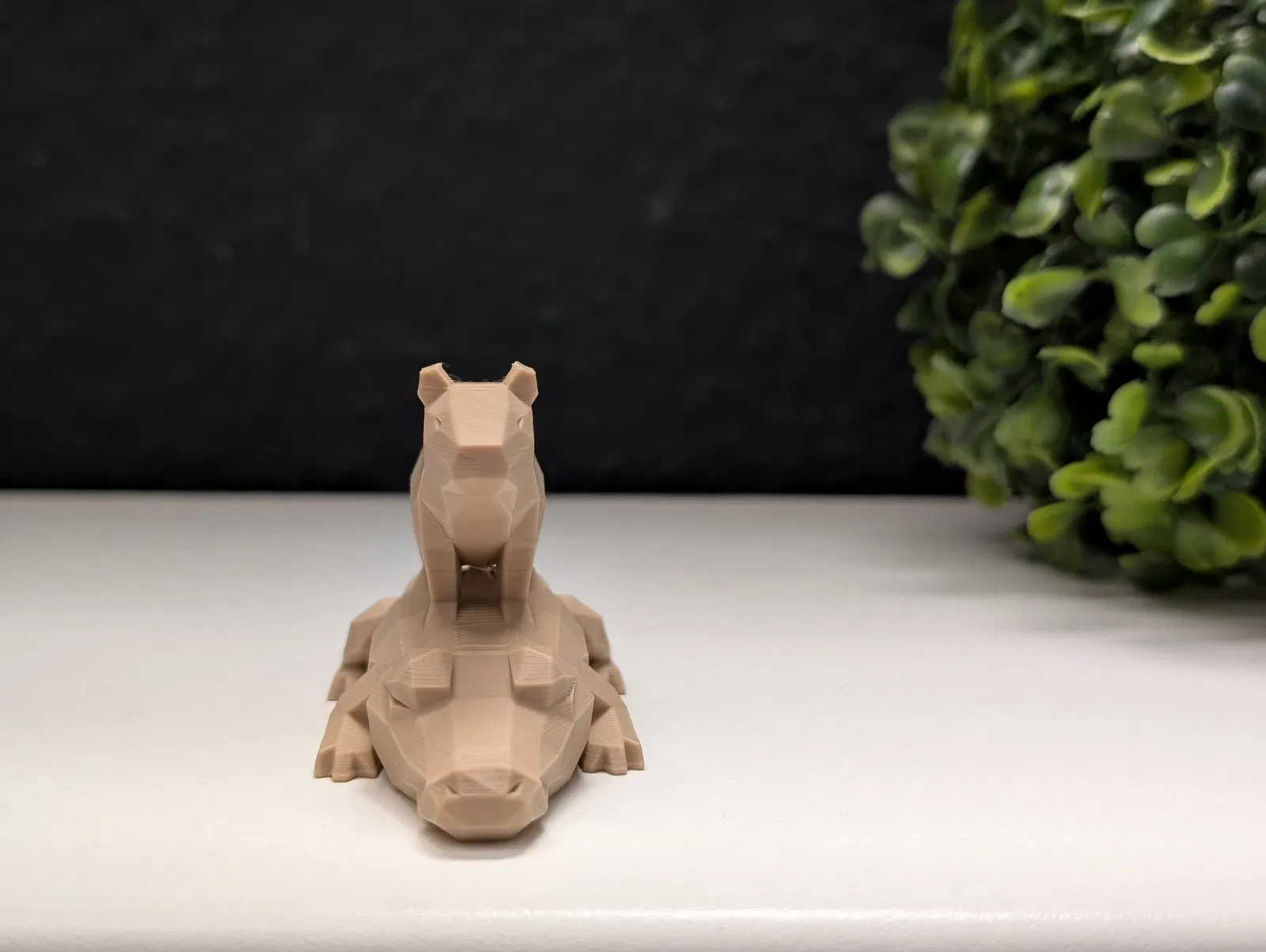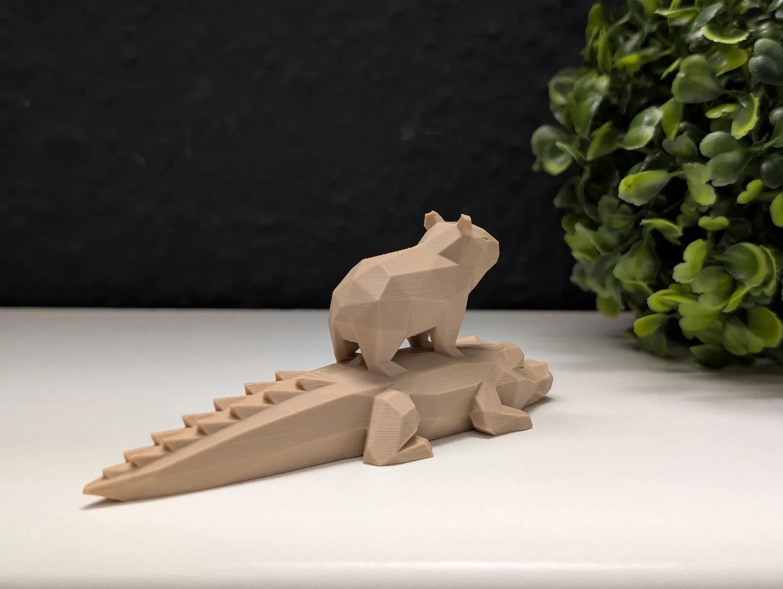 Mẫu Capybara low poly vui nhộn đậu trên lưng cá sấu đang ngủ. In không cần hỗ trợ, hoàn hảo để trang trí, làm quà tặng, hoặc đặt trên bàn làm việc. Kích thước 116mm, in bằng SUNLU Wood color PLA. Khuyến nghị chiều cao lớp thay đổi và infill 10-15%.