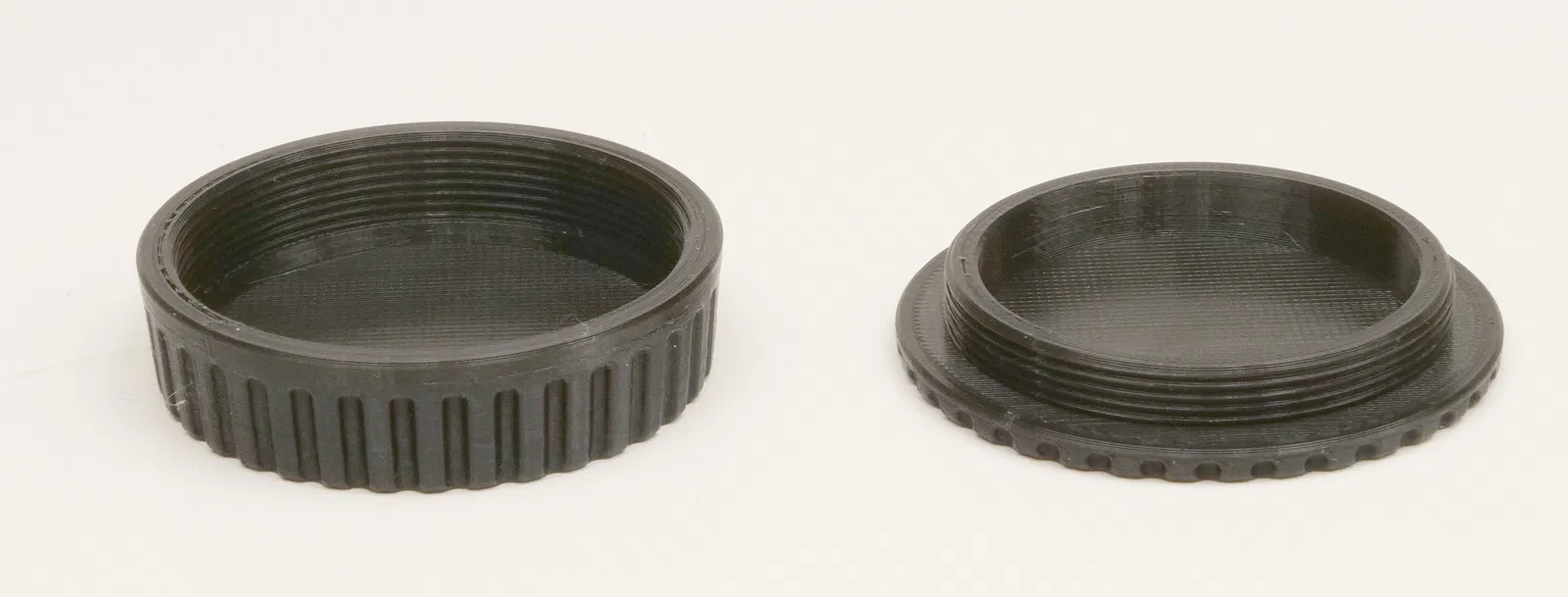 Cái chụp thân máy thì ren M42x1 hơi nhỏ một chút và cái chụp đuôi ống kính thì ren M42x1 hơi to một chút. Điều này đảm bảo vừa vặn lỏng lẻo. Các bản in được hiển thị trong ảnh được thực hiện với chiều cao lớp là 0,15mm.