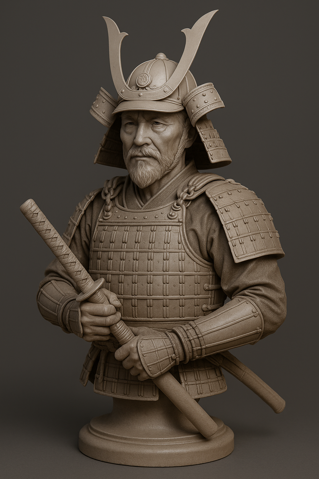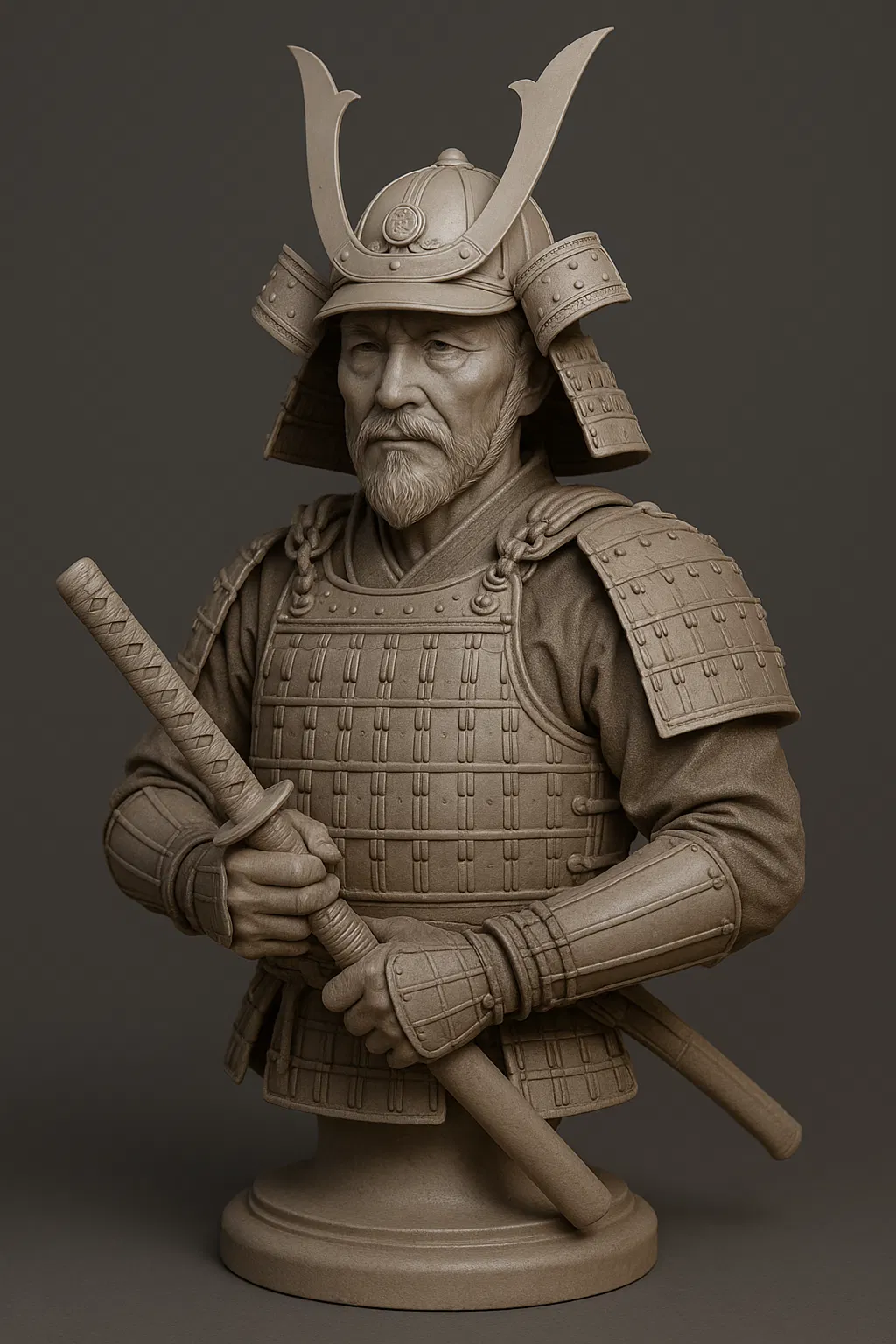 Tượng bán thân 3D của một samurai già, nét mặt thanh tao, trí tuệ, mặc giáp truyền thống Nhật Bản và cầm katana. Kiểu dáng chân thực, tỷ lệ chính xác, hoàn hảo làm vật trưng bày hoặc bộ sưu tập.