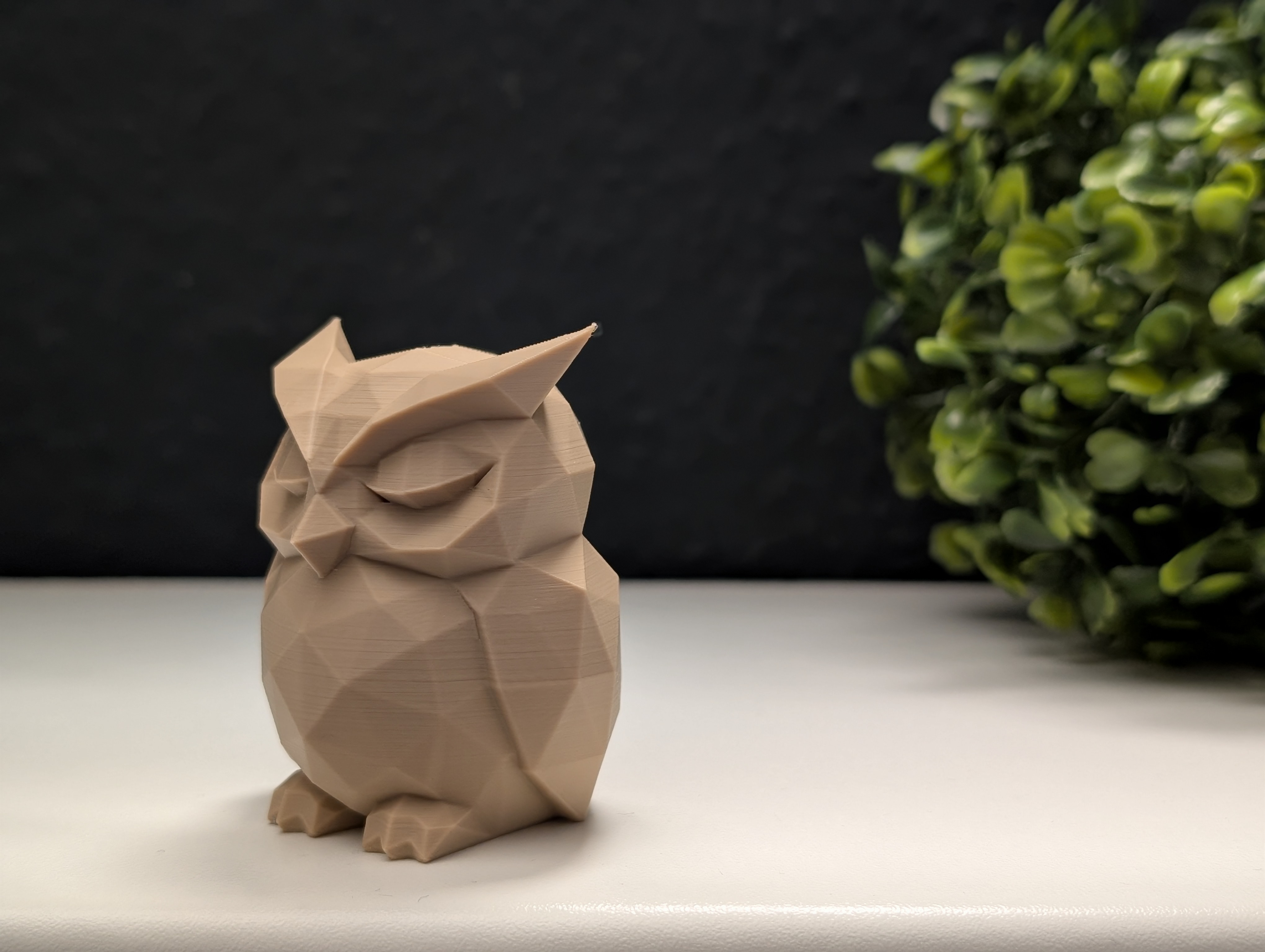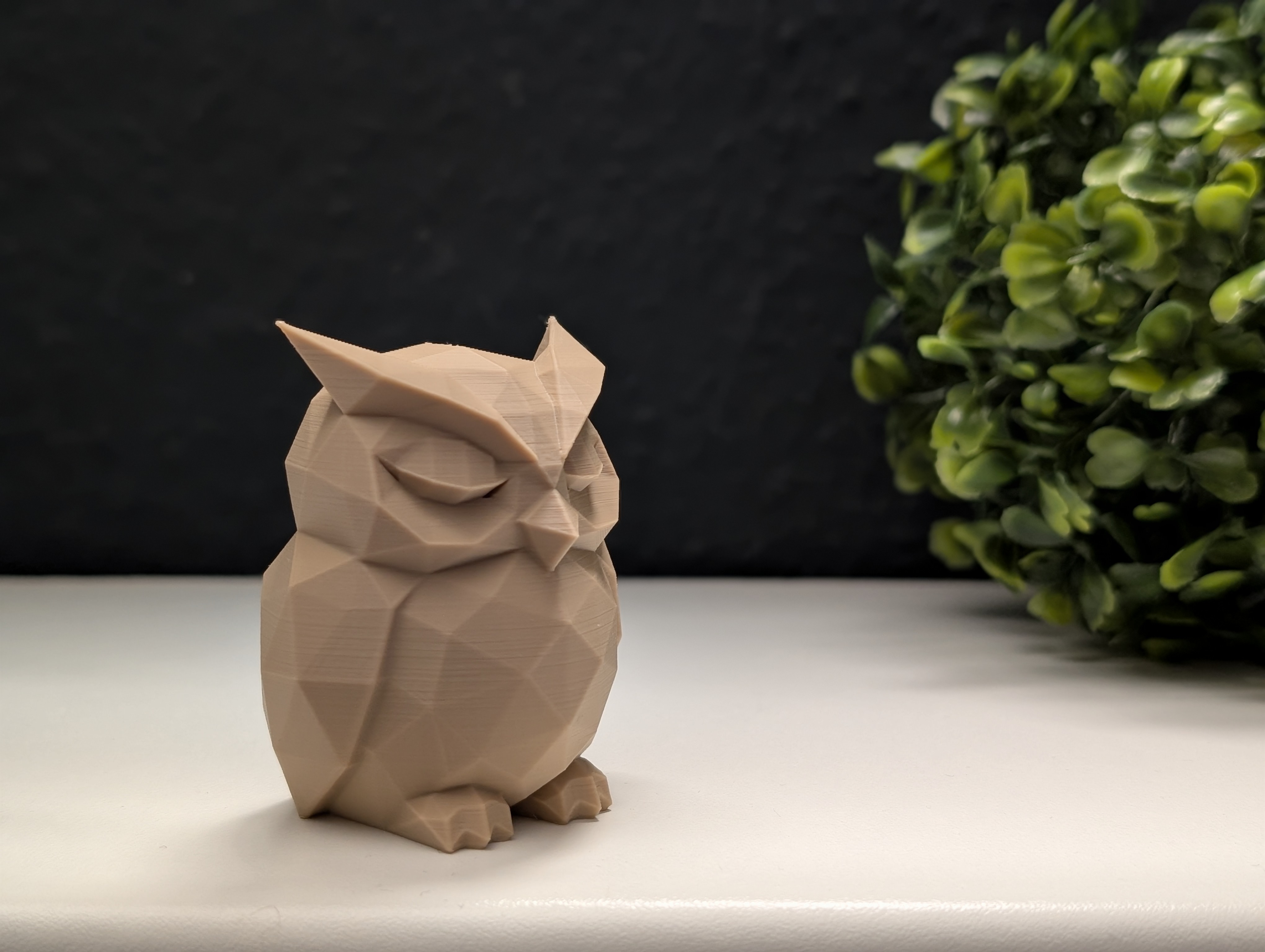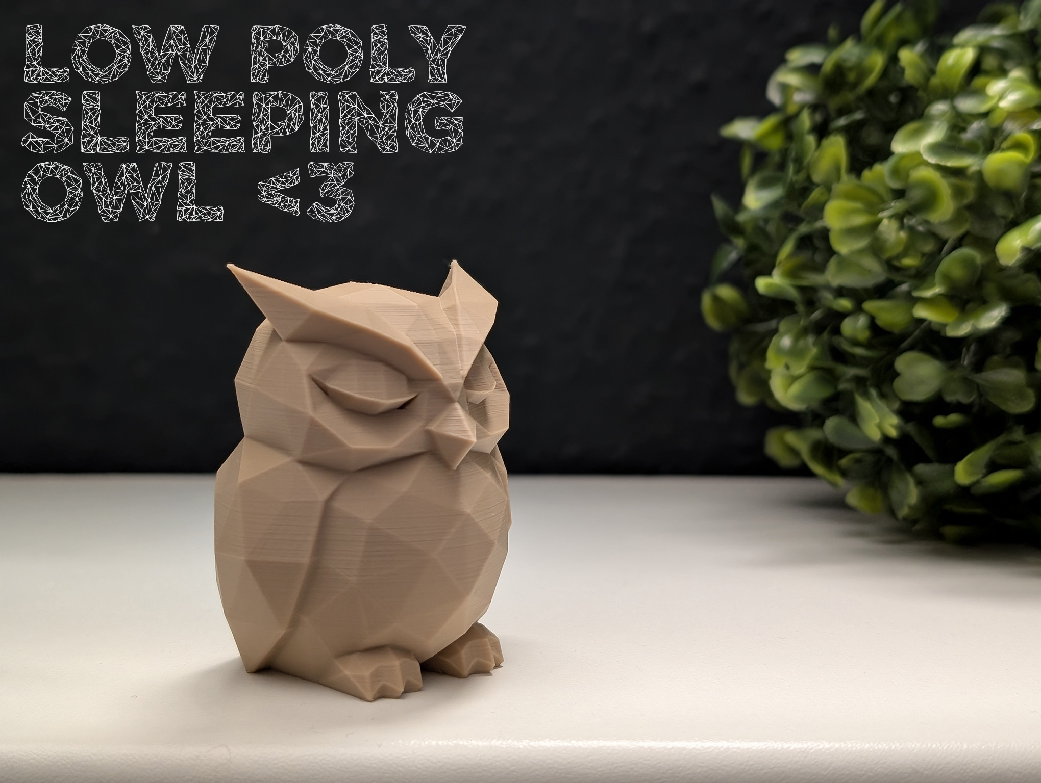 Chú cú lười biếng theo phong cách low poly, đang lim dim ngủ ngày. Không cần support! Kích thước 50 x 47 x 61 mm, in với PLA màu gỗ SUNLU. Rất hợp để trang trí bàn làm việc hoặc làm quà tặng.