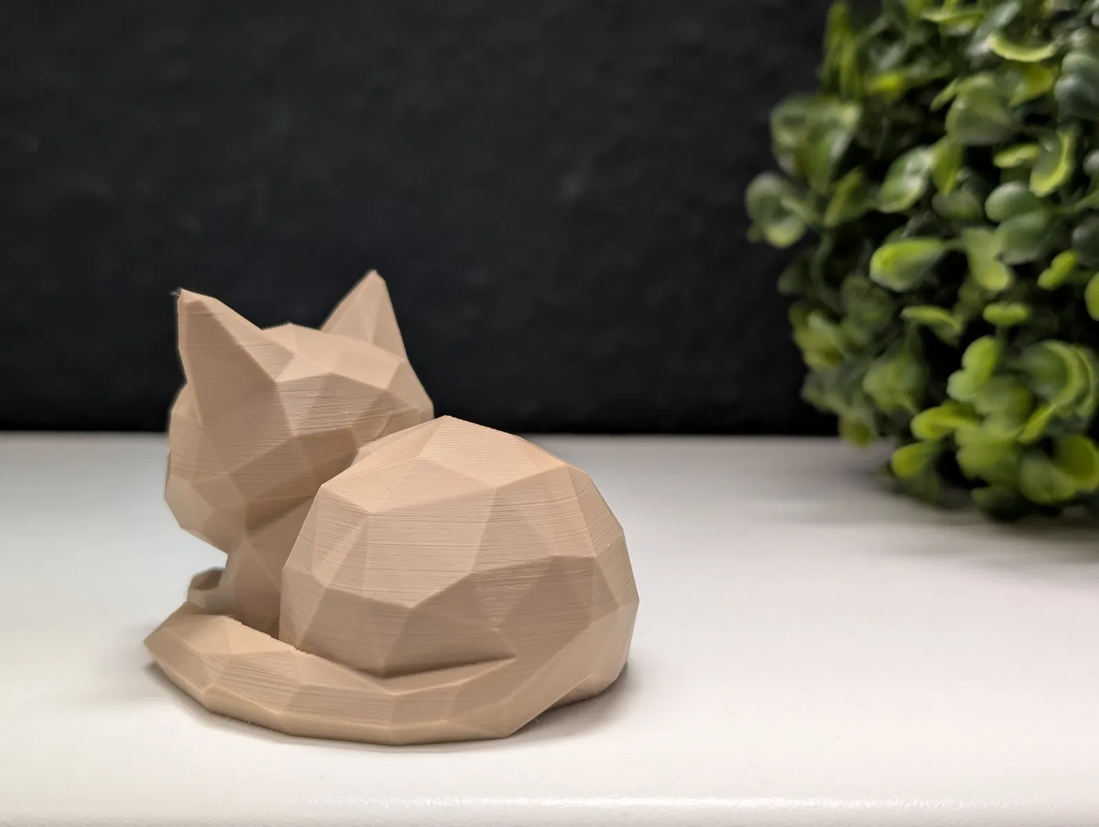 Chú mèo ngủ low poly dễ thương, tối giản, in 3D siêu dễ, không cần chống đỡ. Thích hợp làm đồ trang trí, quà tặng hoặc bạn đồng hành thư giãn trên bàn. Kích thước 71x54x48mm, in với PLA màu gỗ.