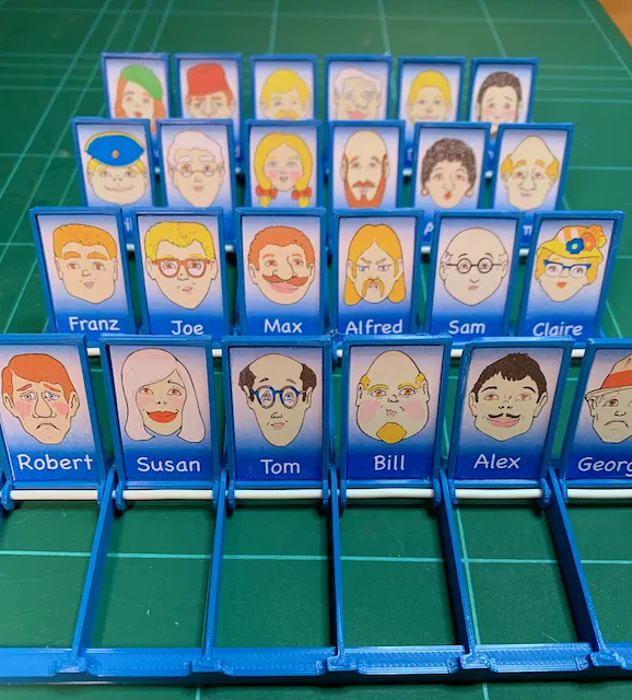 Phiên bản DIY của trò chơi Đoán xem ai kinh điển, bản du lịch có 24 nhân vật thay vì 20 như bản gốc. Dễ dàng lắp ráp với trục bằng filament và bản lề dạng nắp gập. Thích hợp để in ấn với PLA, đầu phun 0.4 và chiều cao lớp 0.2.
