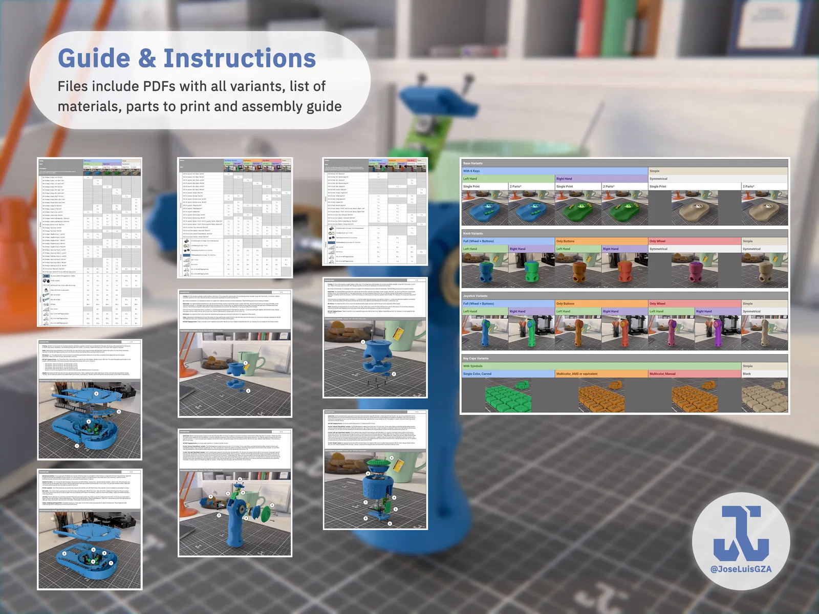 Bản tải xuống bao gồm 4 hướng dẫn lắp ráp PDF cho Đế, Núm Xoay, Joystick và Nắp phím, bao gồm: