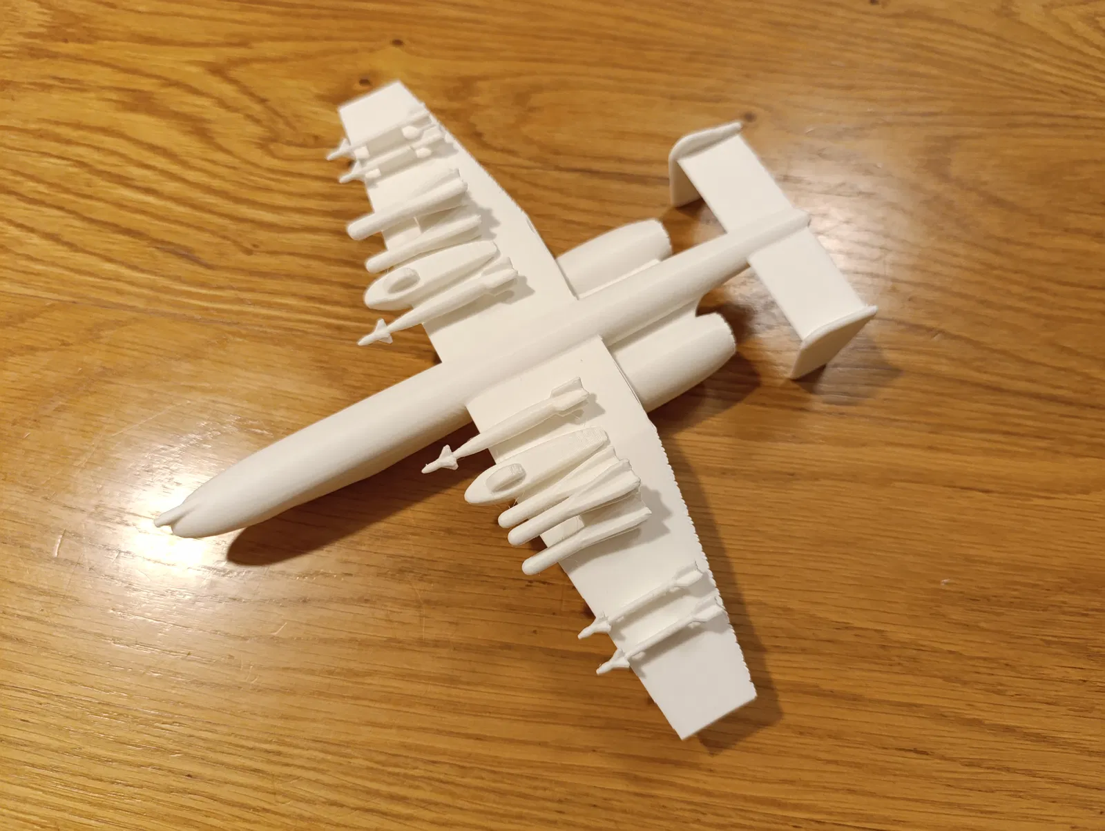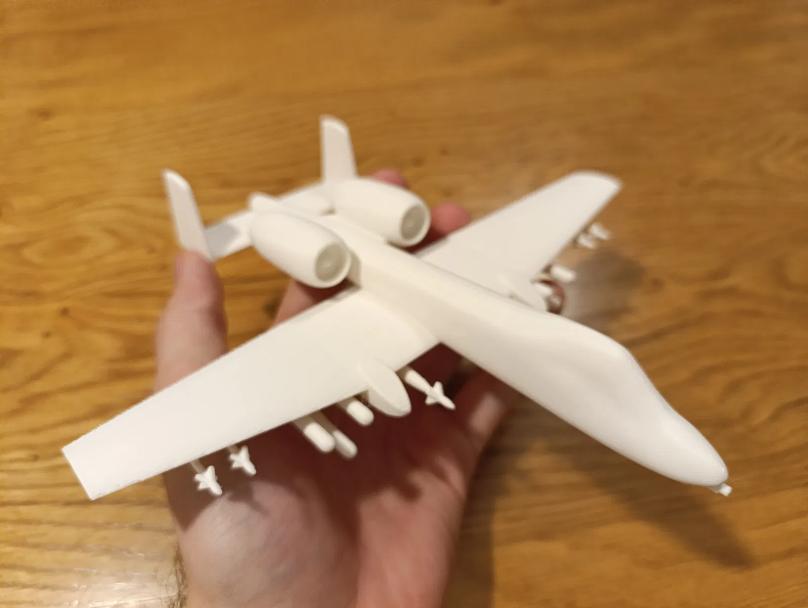 Mô hình máy bay A-10 Warthog, trang bị 4 tên lửa Aim-9 Sidewinder, 6 AGM-65 Maverick và 2 bom Paveway. Nổi tiếng với tiếng khai hỏa "brrrrrrr" của khẩu pháo 30mm, A-10 là máy bay yểm trợ cận không huyền thoại. Mô hình này được in ở góc 50 độ để có bề mặt mượt mà.