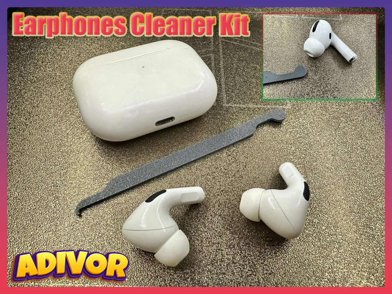 Bộ vệ sinh tai nghe dễ làm, giúp bạn loại bỏ bụi bẩn khỏi cổng USB và làm sạch phần bên trong của tai nghe, vốn thường bị bám bẩn. Chỉ tốn 1 gram vật liệu và 8 phút in.