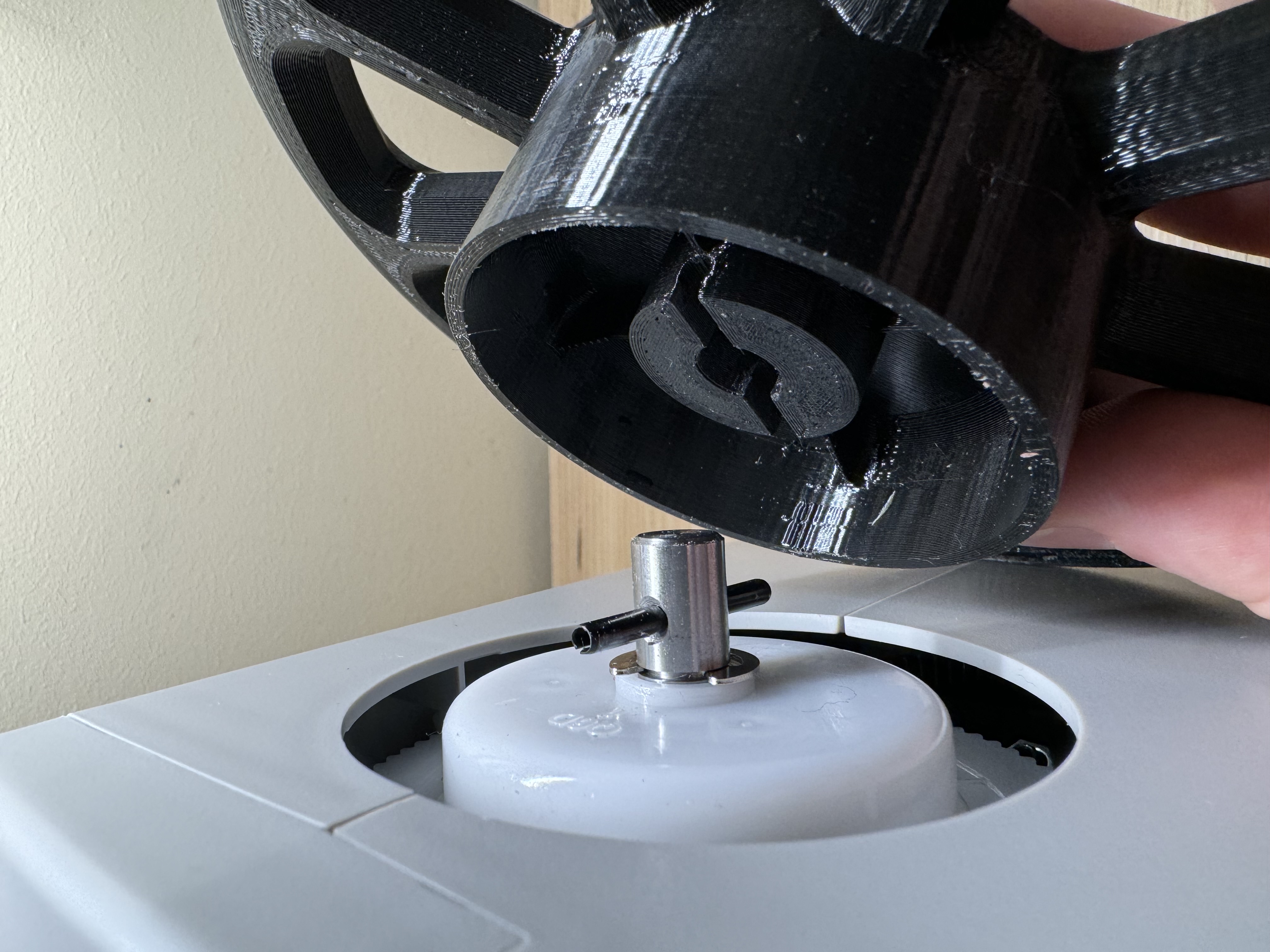 - Canh mấy cái lỗ khóa trên handwheel in 3D với cái chốt trên trục.