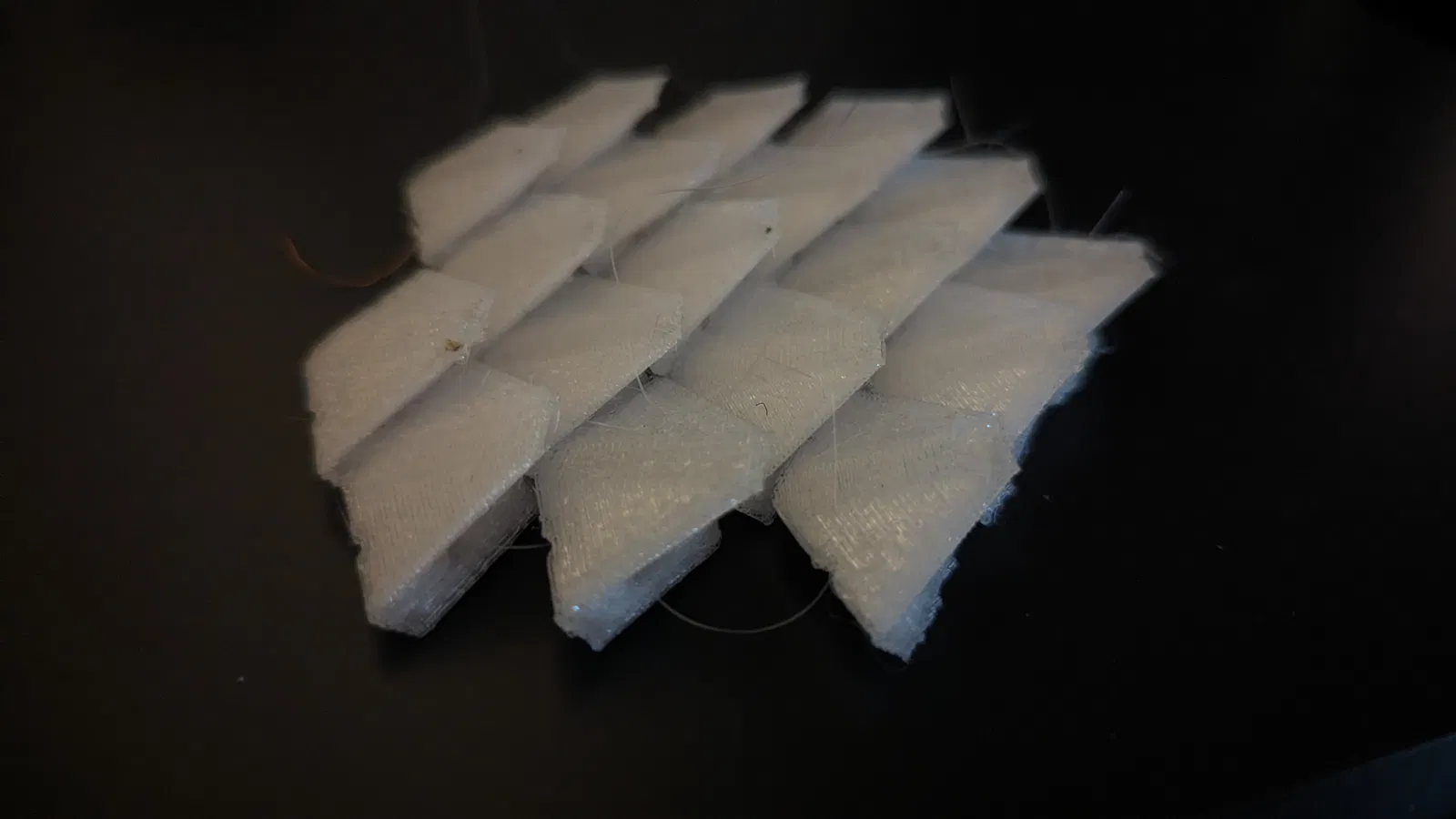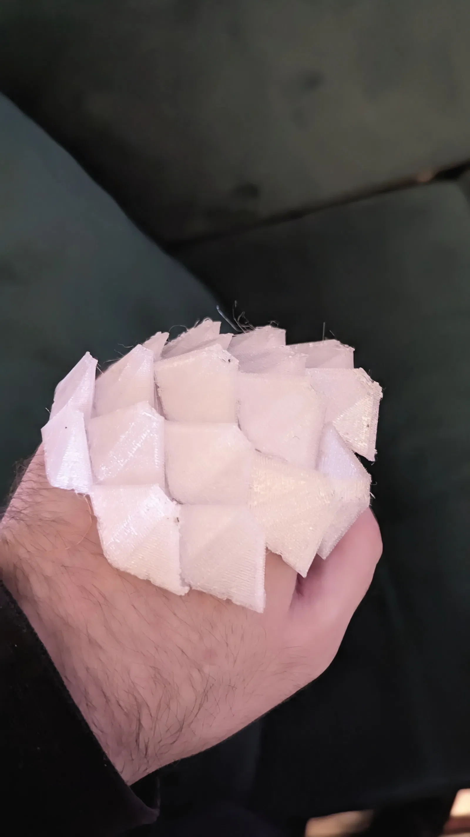 Mấy cái vảy giáp này có cái cạnh cong đặc biệt, có thể chặn răng, móng vuốt và lưỡi dao, ngăn chúng chui lọt vào giữa hai vảy. Tui thiết kế nó với góc chuyển động 30° giữa hai vảy ở mỗi hướng, nên cần khoảng ba cái vảy để tạo thành một góc cong 90° cho bộ giáp. Ở kích thước vảy khoảng 10mm thì bộ giáp này đã có cảm giác mềm mại như vải hơn là giáp rồi.