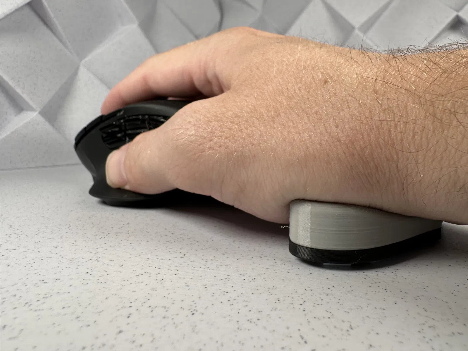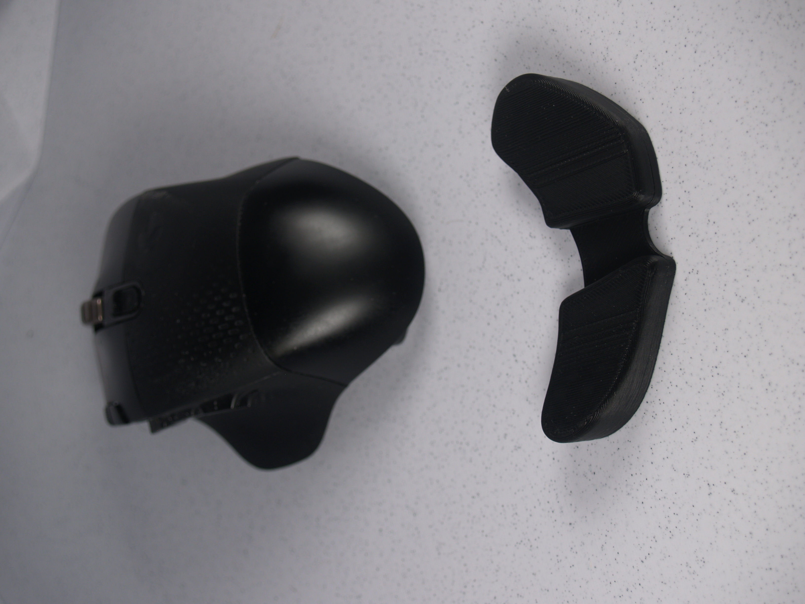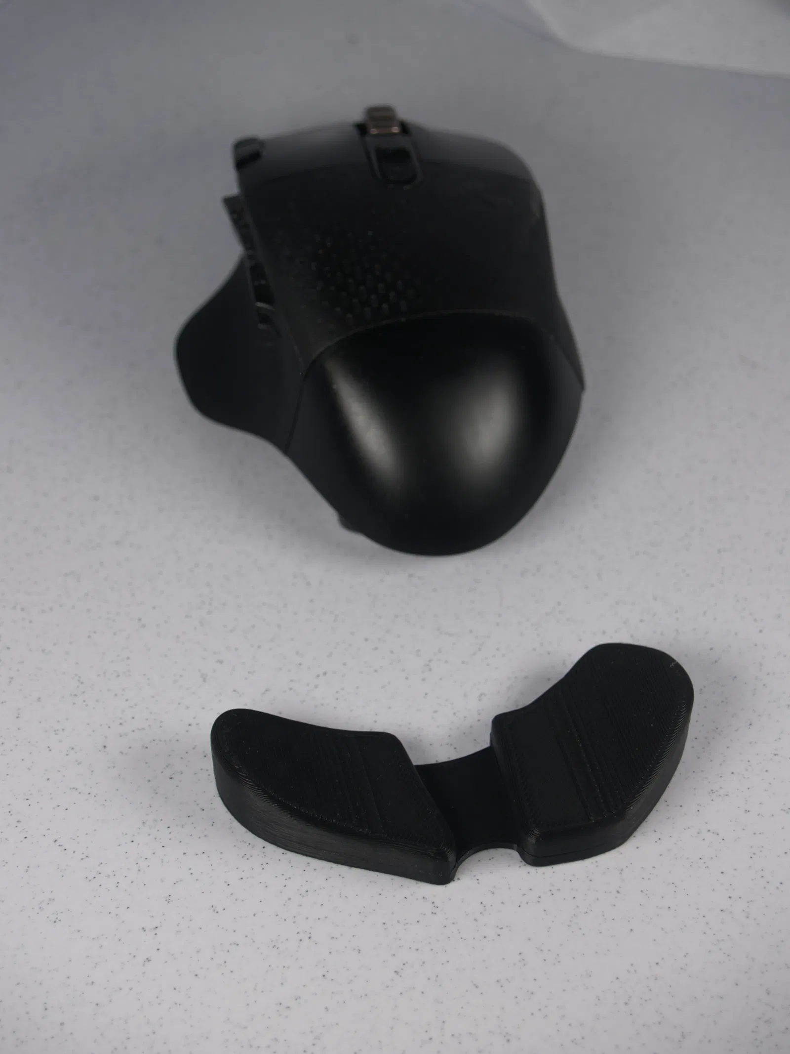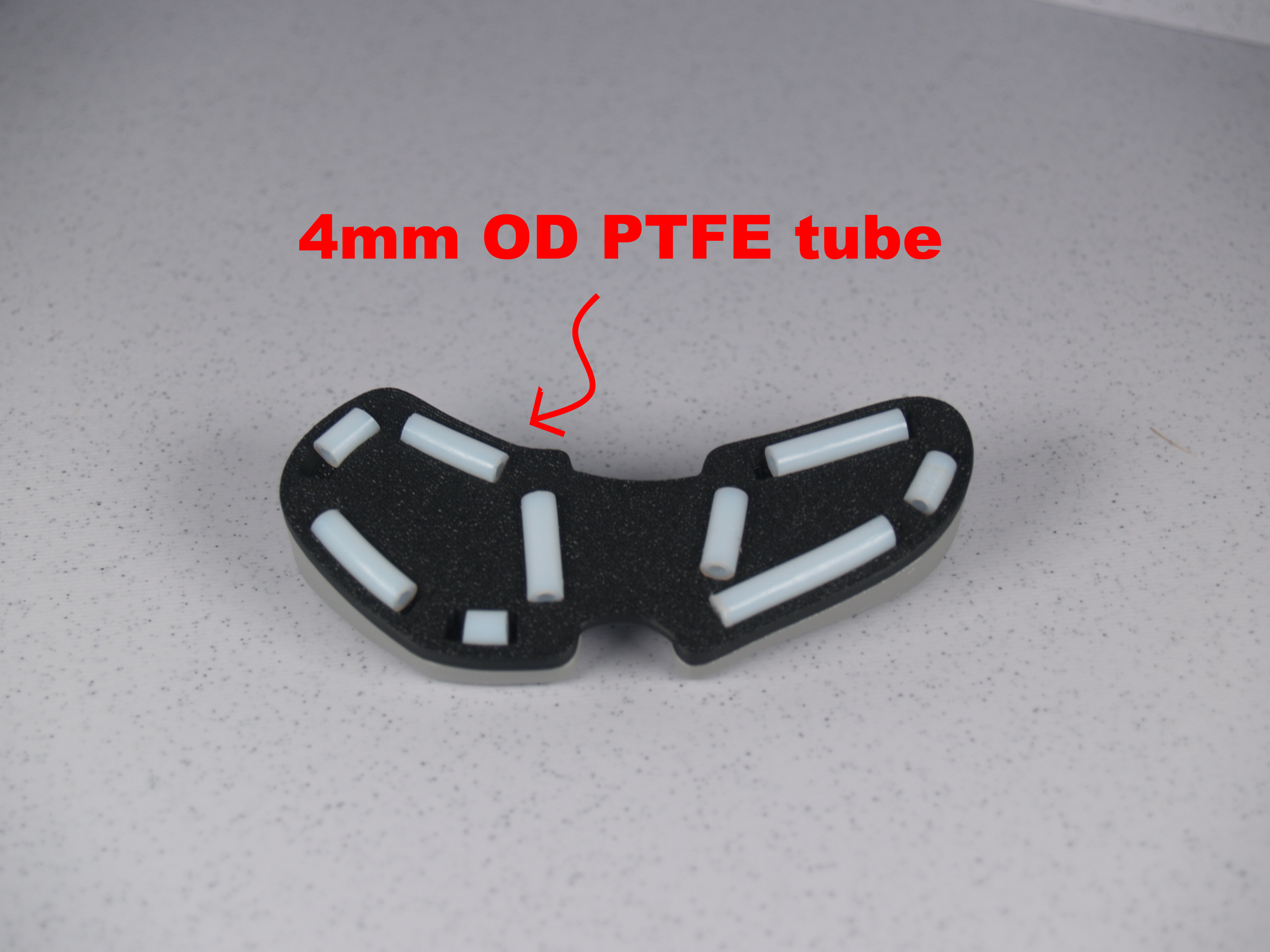 Miếng đệm tay có thể in bằng sợi nhựa dẻo (flexible filament) cho cảm giác êm ái, mềm mại hơn, hoặc bằng sợi nhựa cứng (rigid filament) để được hỗ trợ chắc chắn hơn. Đế và miếng đệm khớp với nhau để lắp ráp dễ dàng. Để trượt mượt mà, bạn chỉ cần cắt vài đoạn ống PTFE có đường kính ngoài 4mm và gắn chúng vào đế.