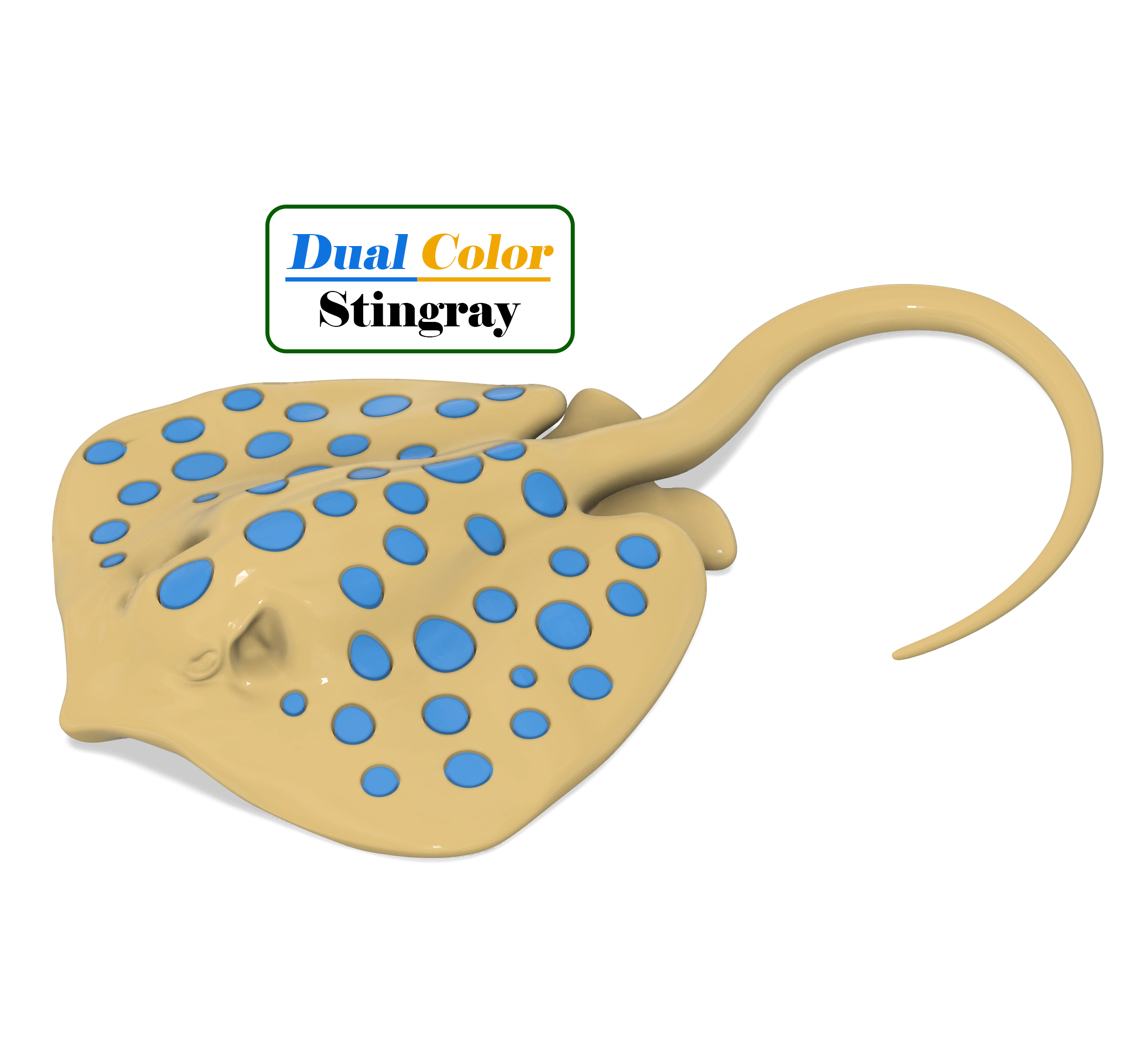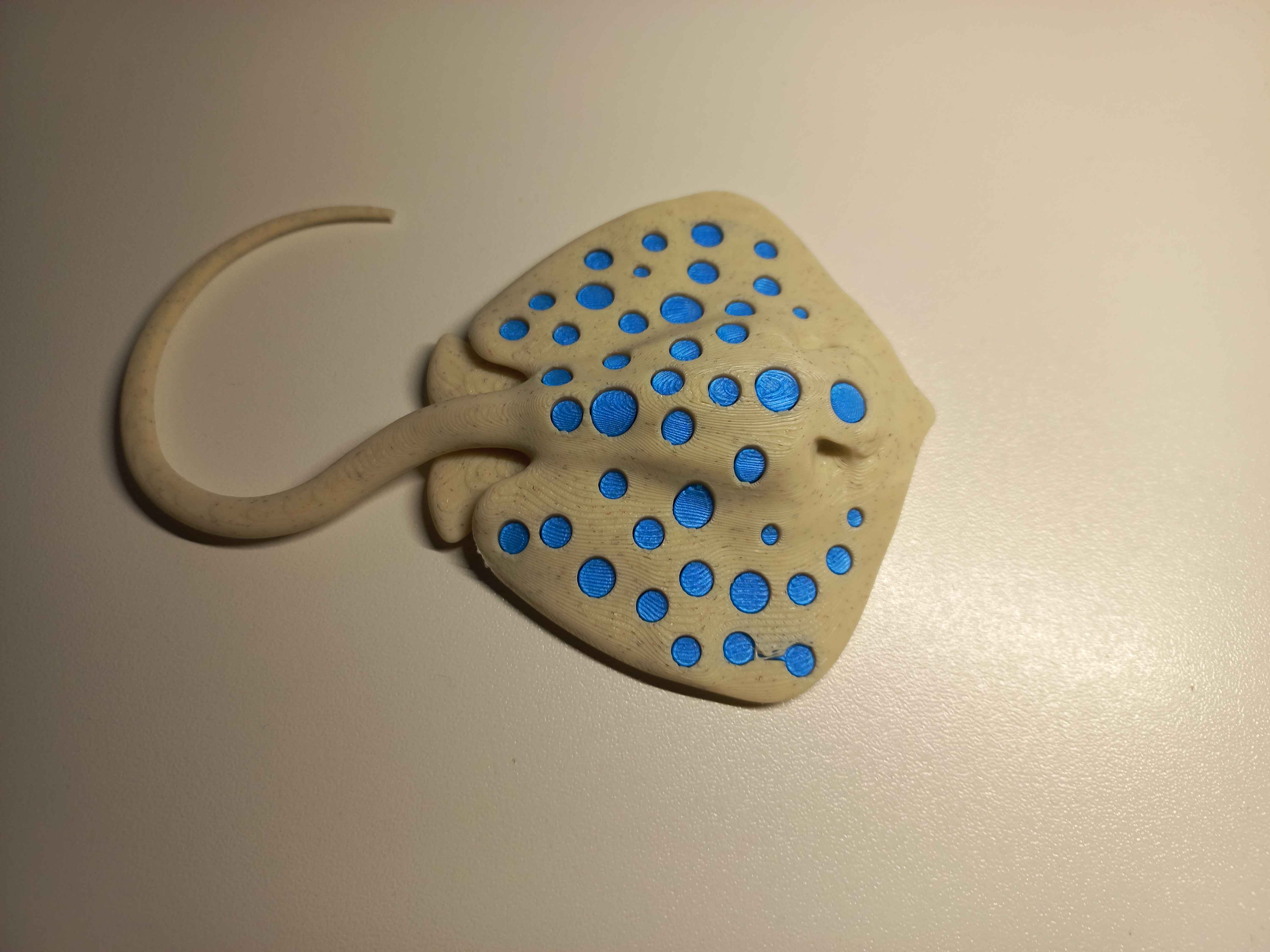 Mô hình cá đuối được tùy chỉnh với kỹ thuật hai màu. Mô hình in gồm hai phần lồng vào nhau. File fusion360 có sẵn để bạn tùy chỉnh dung sai và cách in, khuyến khích dùng tree supports và brim để dễ in hơn.