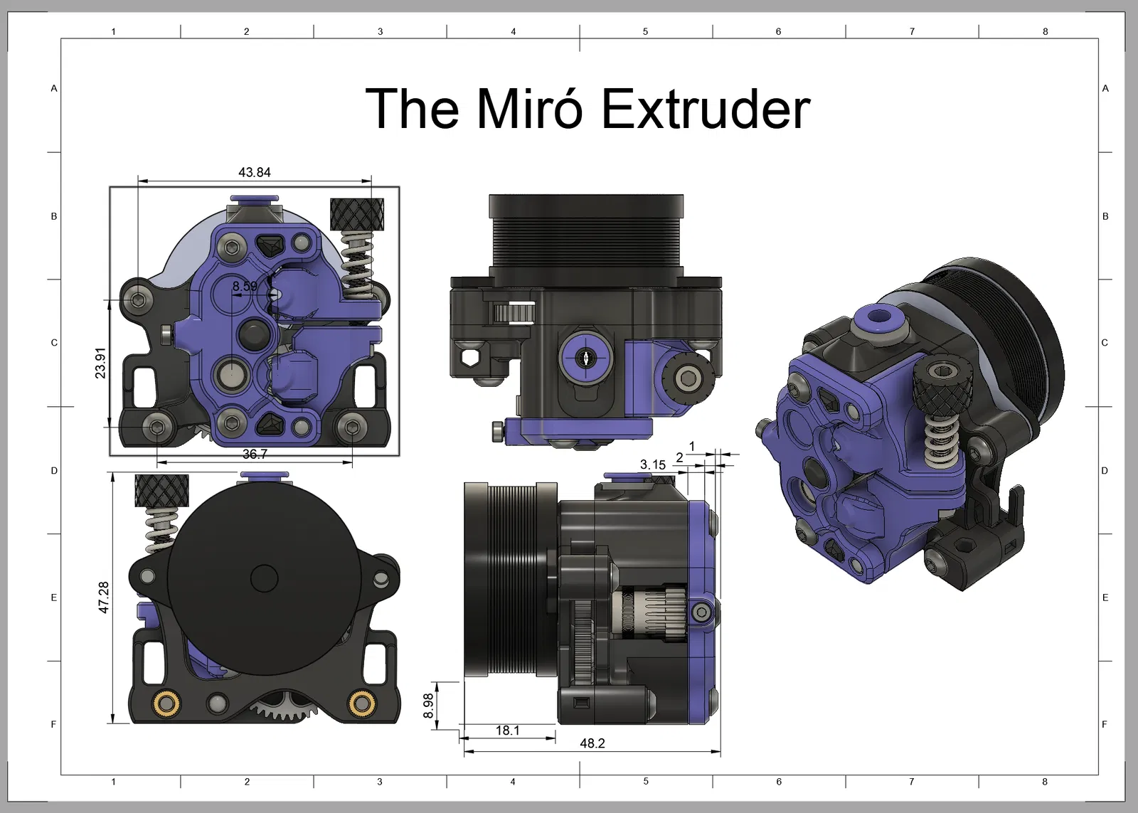 Cái Miró Extruder là một bộ phận đùn nhựa cho máy in 3D hiệu suất cao, hai trục kéo, được thiết kế để kiểm soát sợi nhựa chính xác và đáng tin cậy bằng cách sử dụng hai bộ bánh răng kép. Nó có thiết kế nhỏ gọn và tương thích hoàn toàn với khuôn ốc của bộ phận đùn Sherpa Mini.