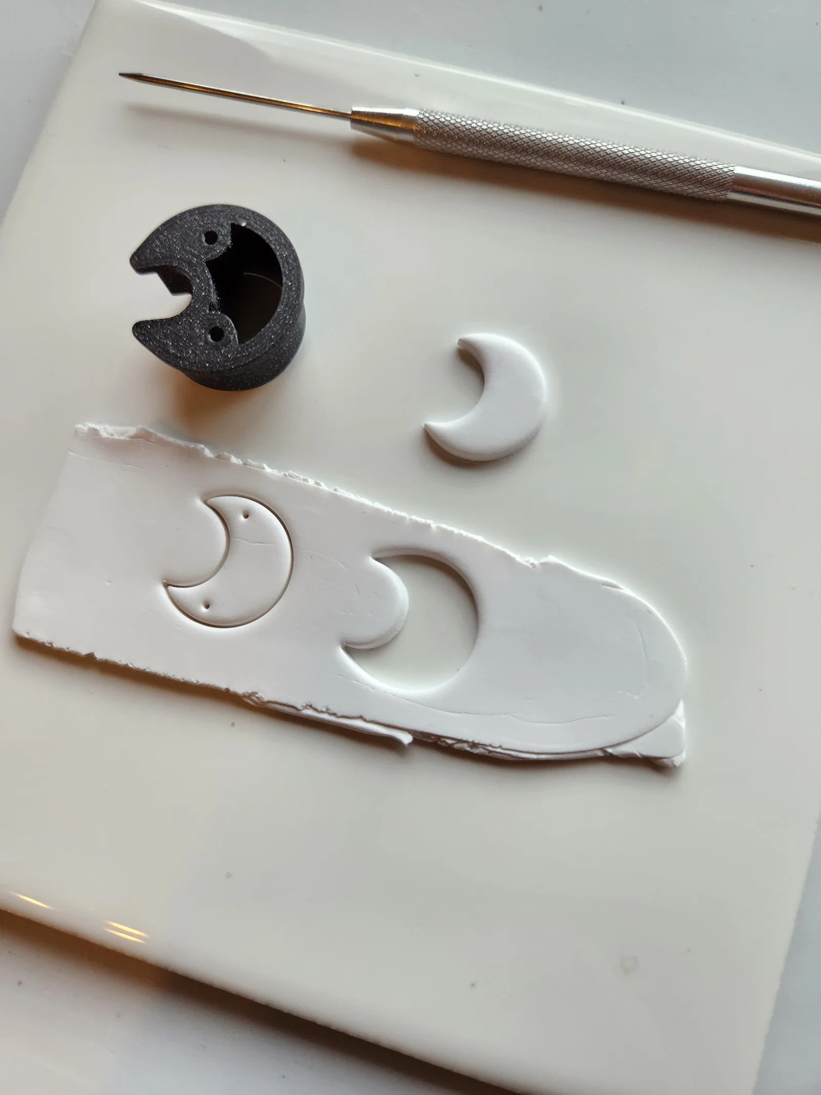Khuôn cắt đất sét polymer dùng làm bông tai hình mặt trăng, với cạnh cắt 0.4mm siêu bén. Chiều cao 20mm. Dùng kim luồn đánh dấu lỗ khoan trước khi nung đất sét. Cài đặt in gợi ý: đầu phun 0.4mm, cao độ lớp 0.2mm.