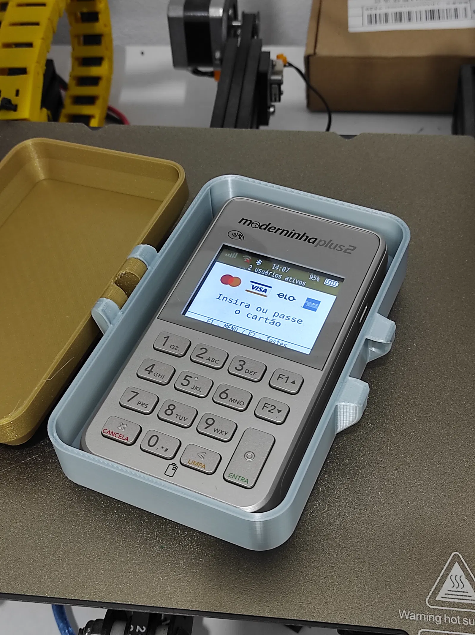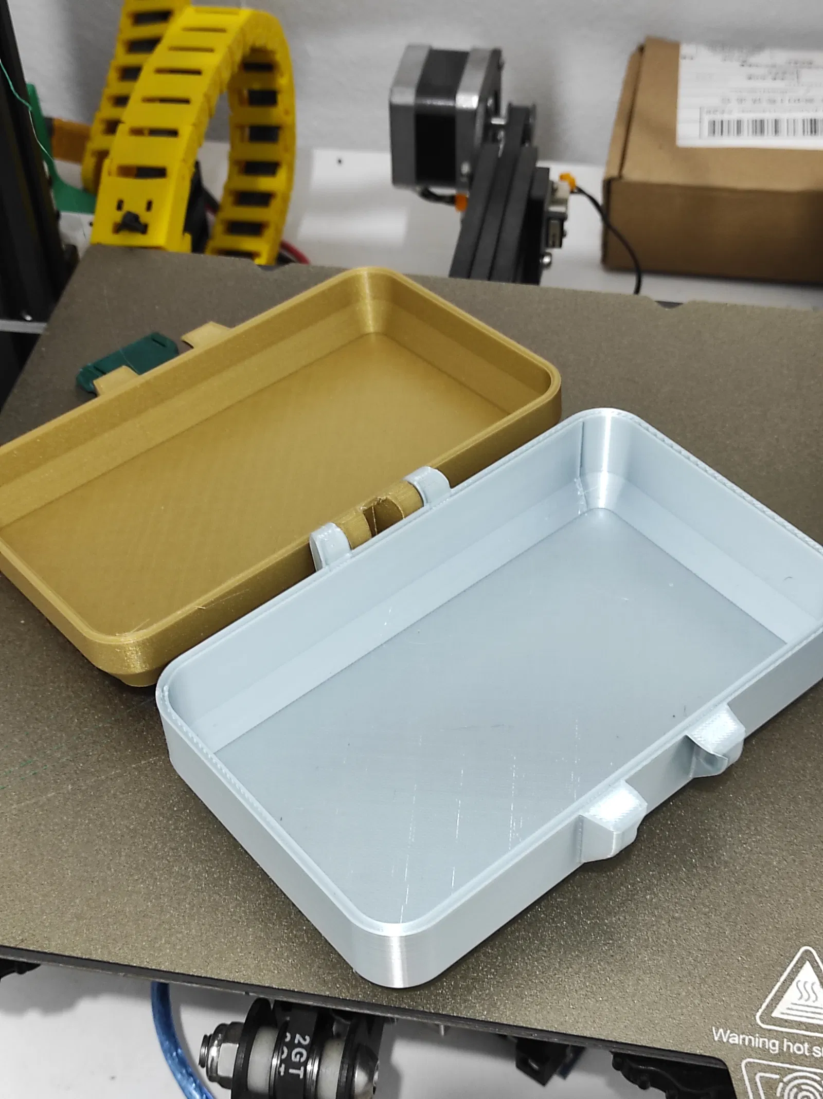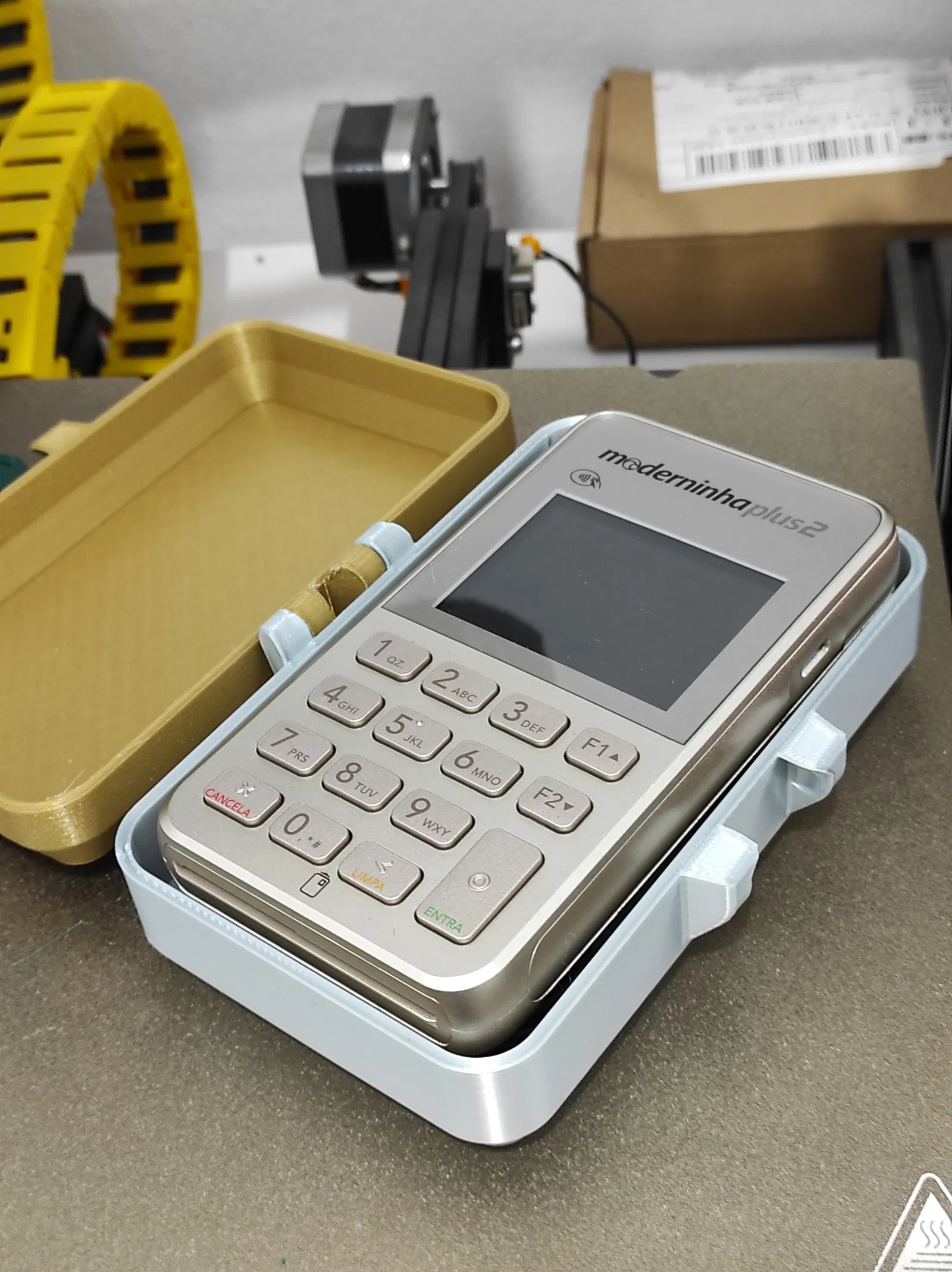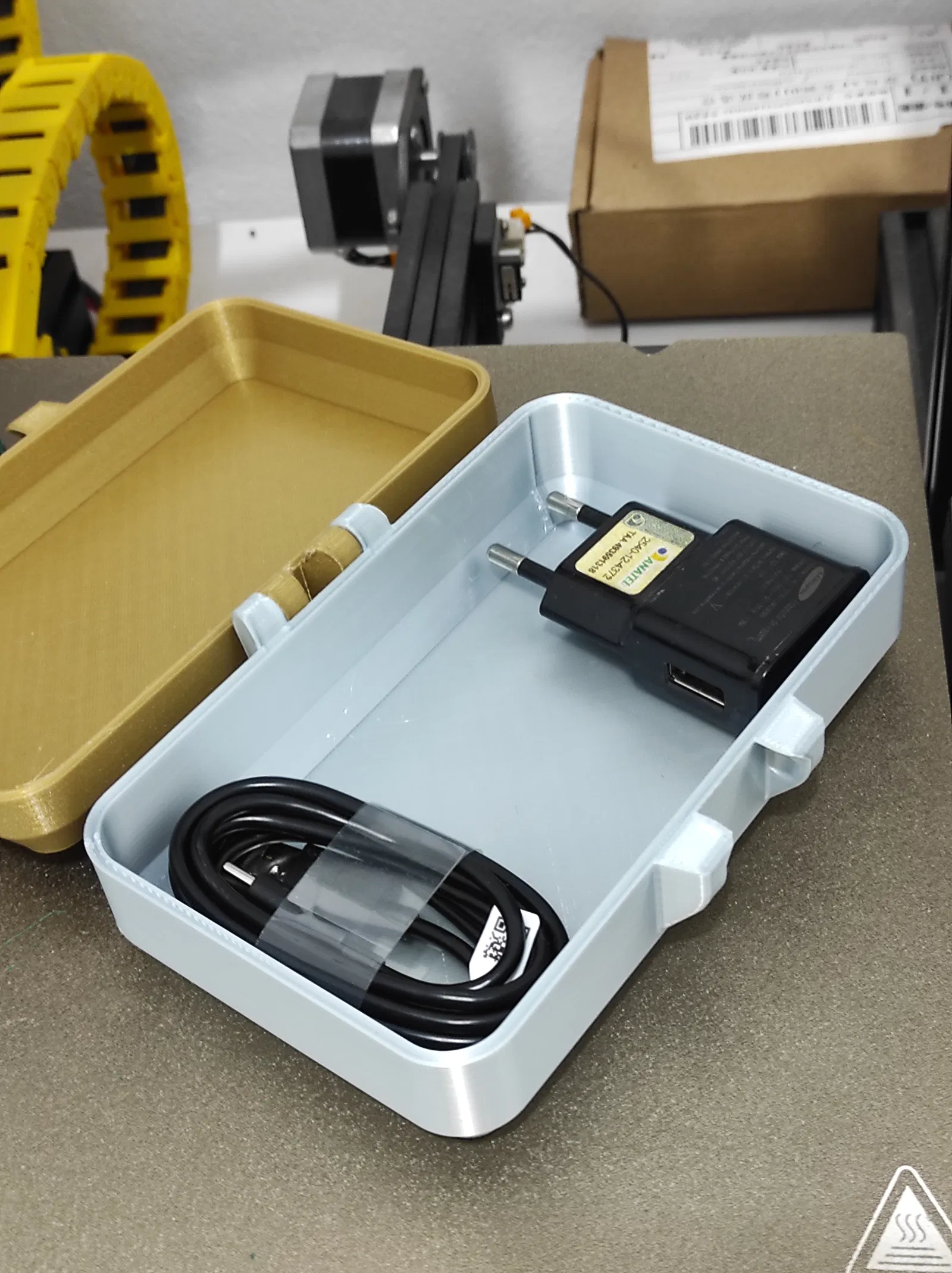 Hộp lưu trữ đa năng, 80x128x30mm, có thể đựng vừa máy POS D175 kèm sạc và dây cáp USB. Bạn cũng có thể dùng nó để cất giữ nhiều thứ khác. In phần nắp và đáy bằng PLA với 3 lớp viền, còn phần khóa thì in bằng PET-G.