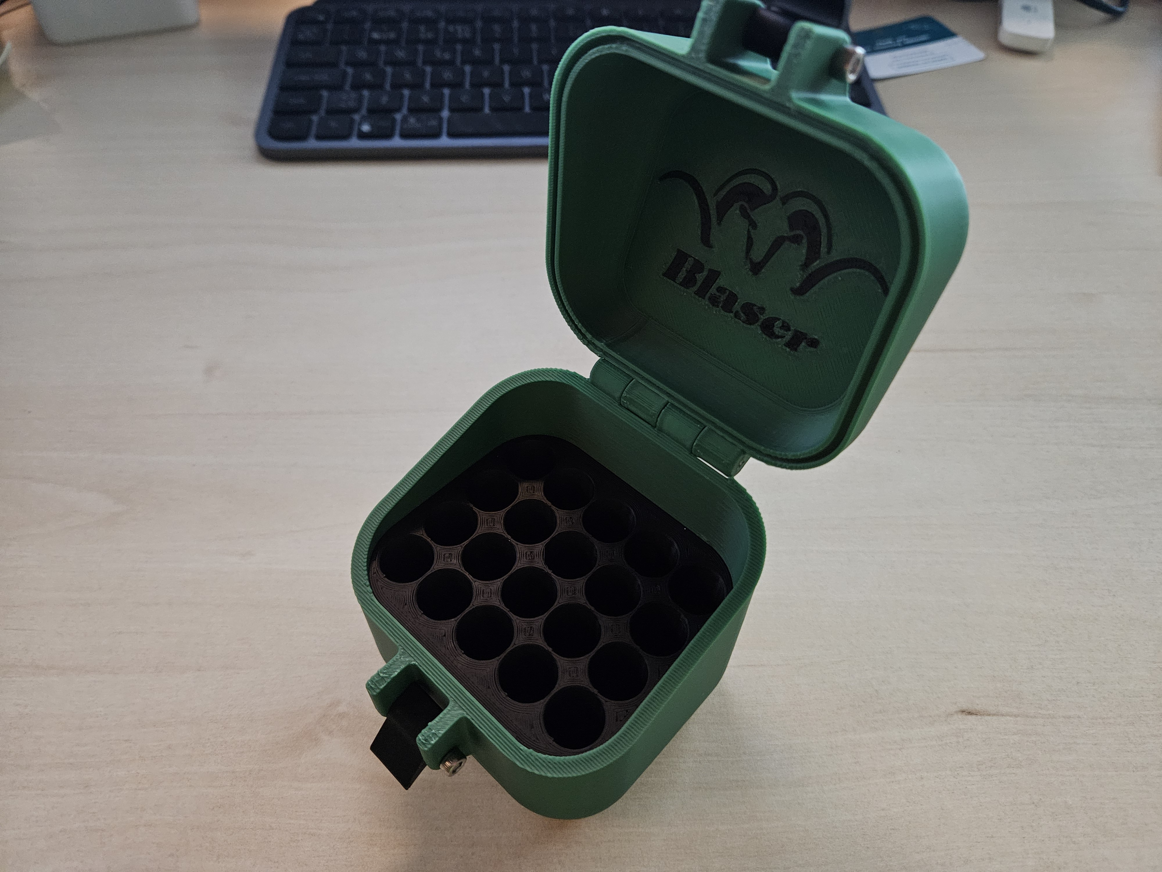Có người nhờ làm hộp đựng đạn .308 Blaser, với khoảng cách giữa phần chèn trên và dưới là 20 viên/12,6x75,24mm. Tui đã sửa bản lề yếu và làm 3 mẫu logo khác nhau. Bạn cần thêm ốc M3x20mm và cây hàn tig 1,6mm.