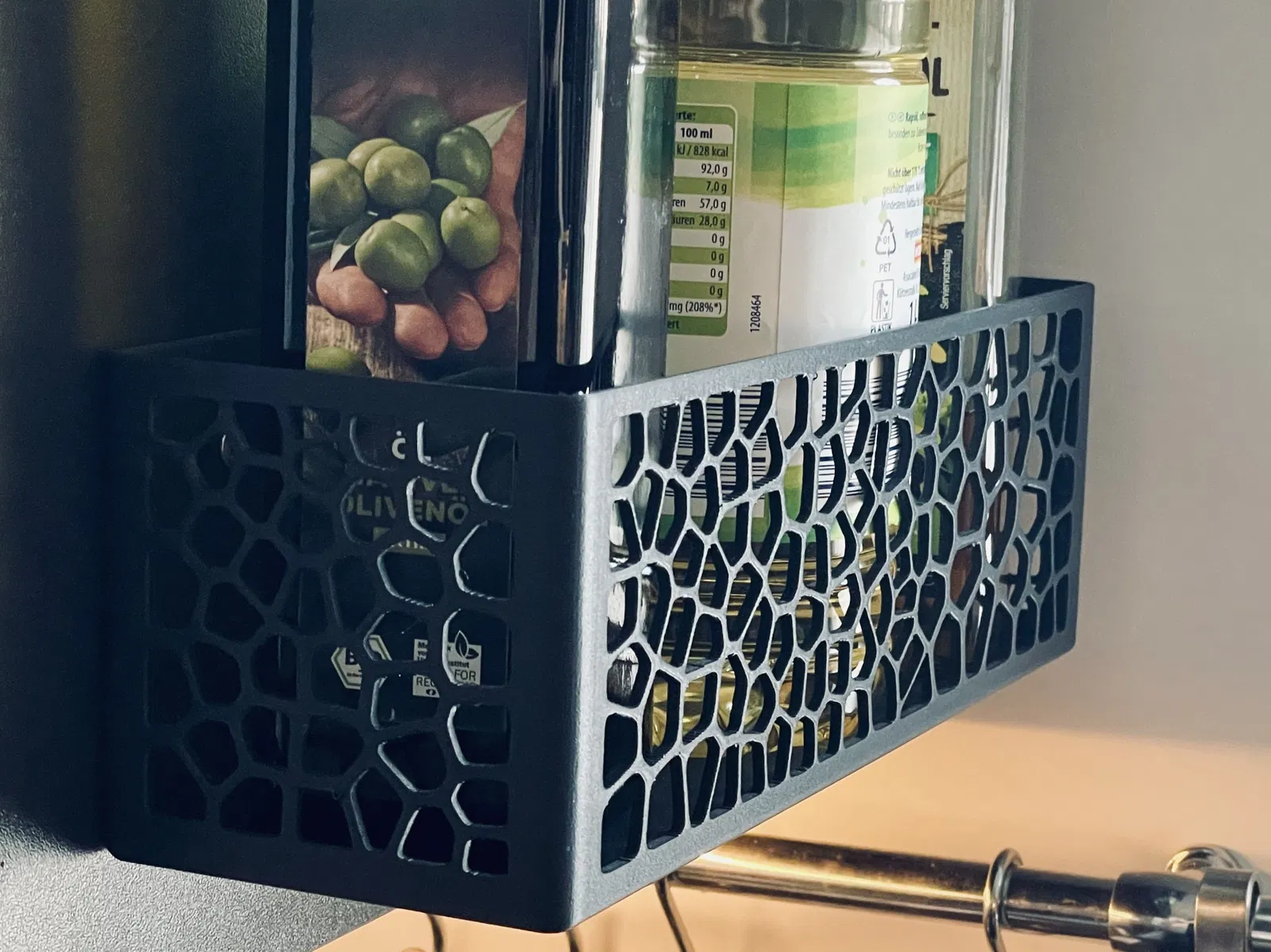 Kệ dầu ăn dạng Voronoi, thiết kế để đựng 3 chai dầu lớn (1000ml) hoặc 4 chai nhỏ (0.5l), cũng có thể dùng đựng giấm hoặc các loại chai lọ khác. Bản in 3 lớp tường, không cần hỗ trợ. Khuyến nghị dùng PLA-CF và PETG-CF với độ dày lớp .2.