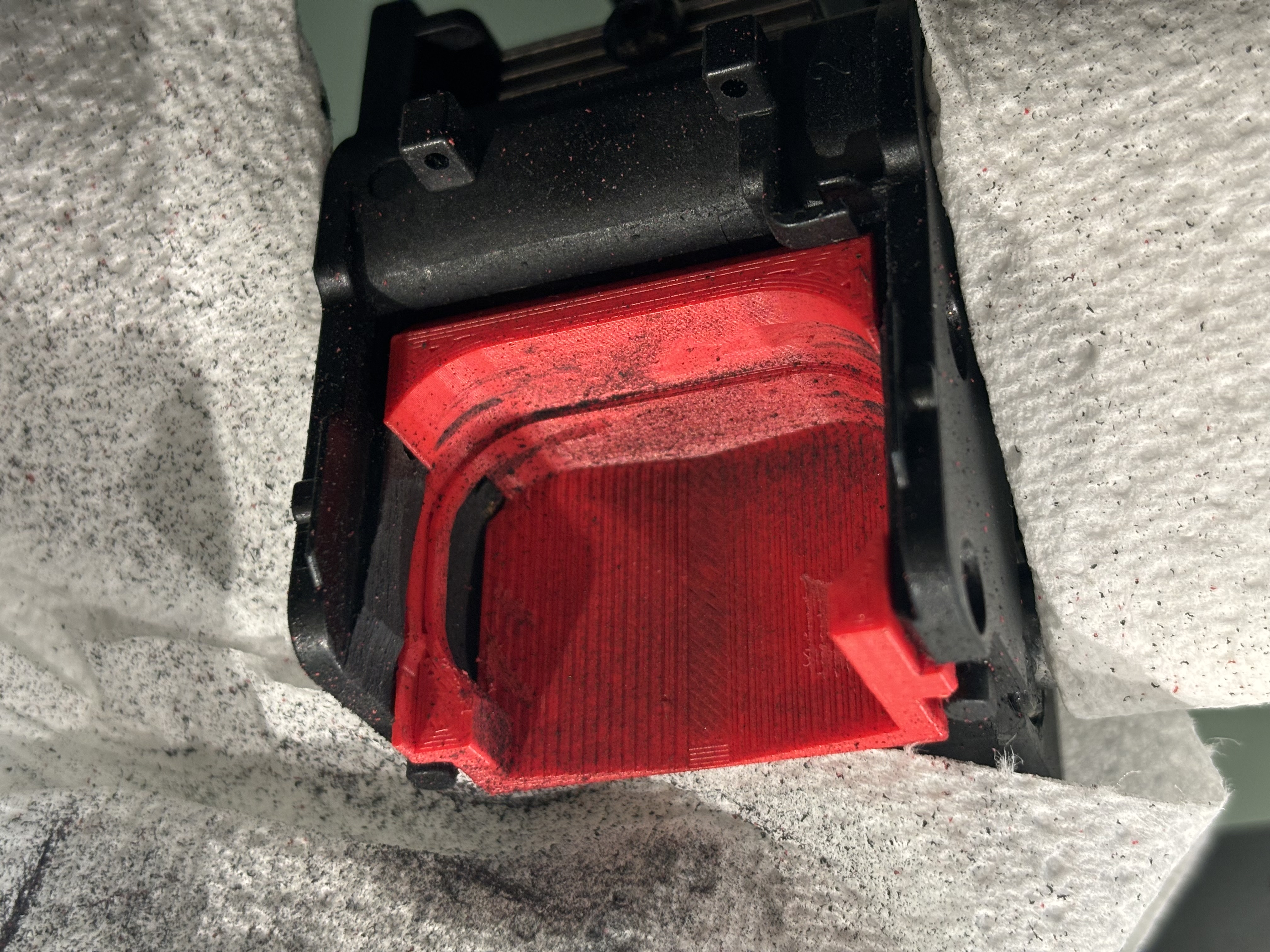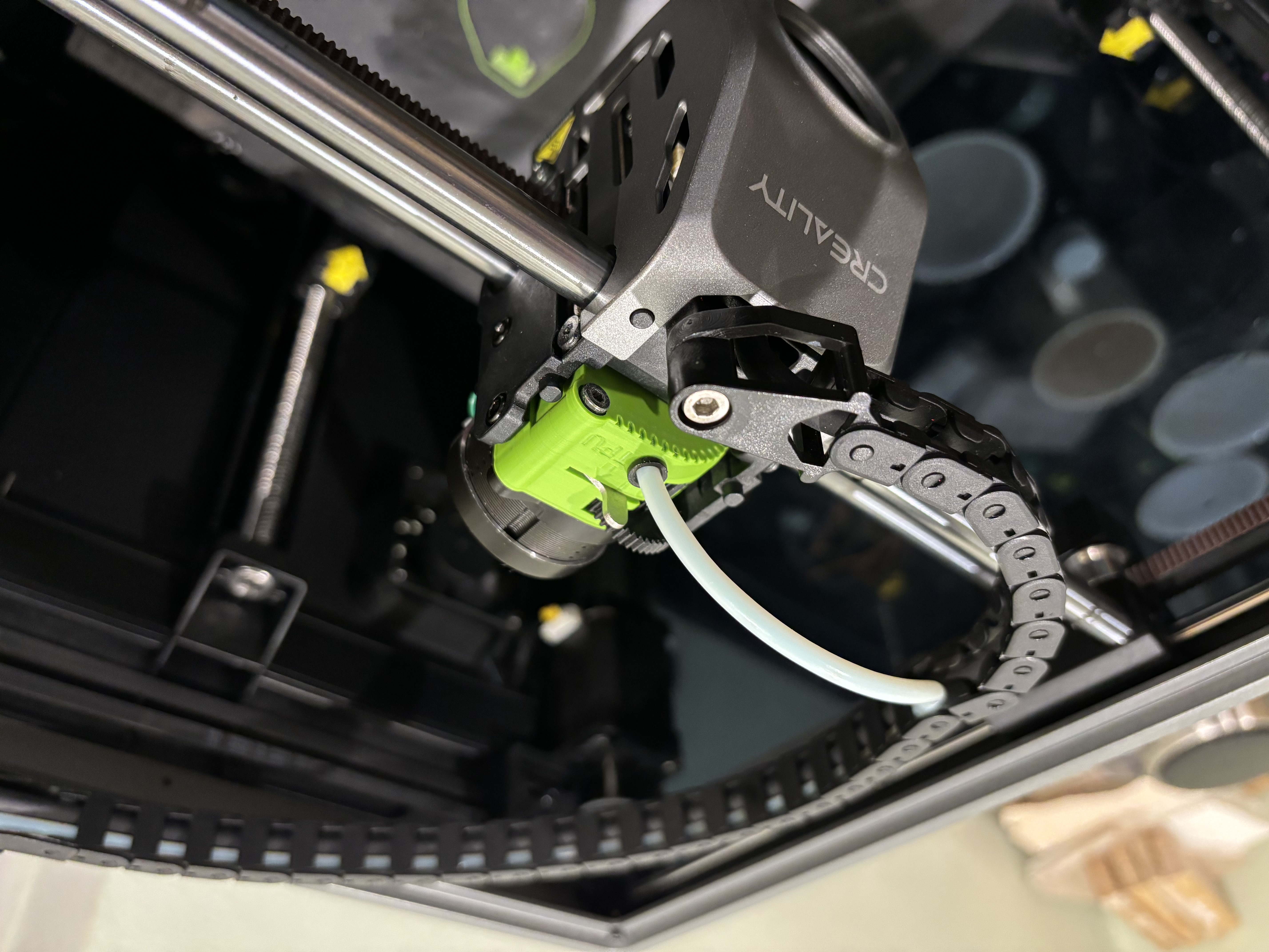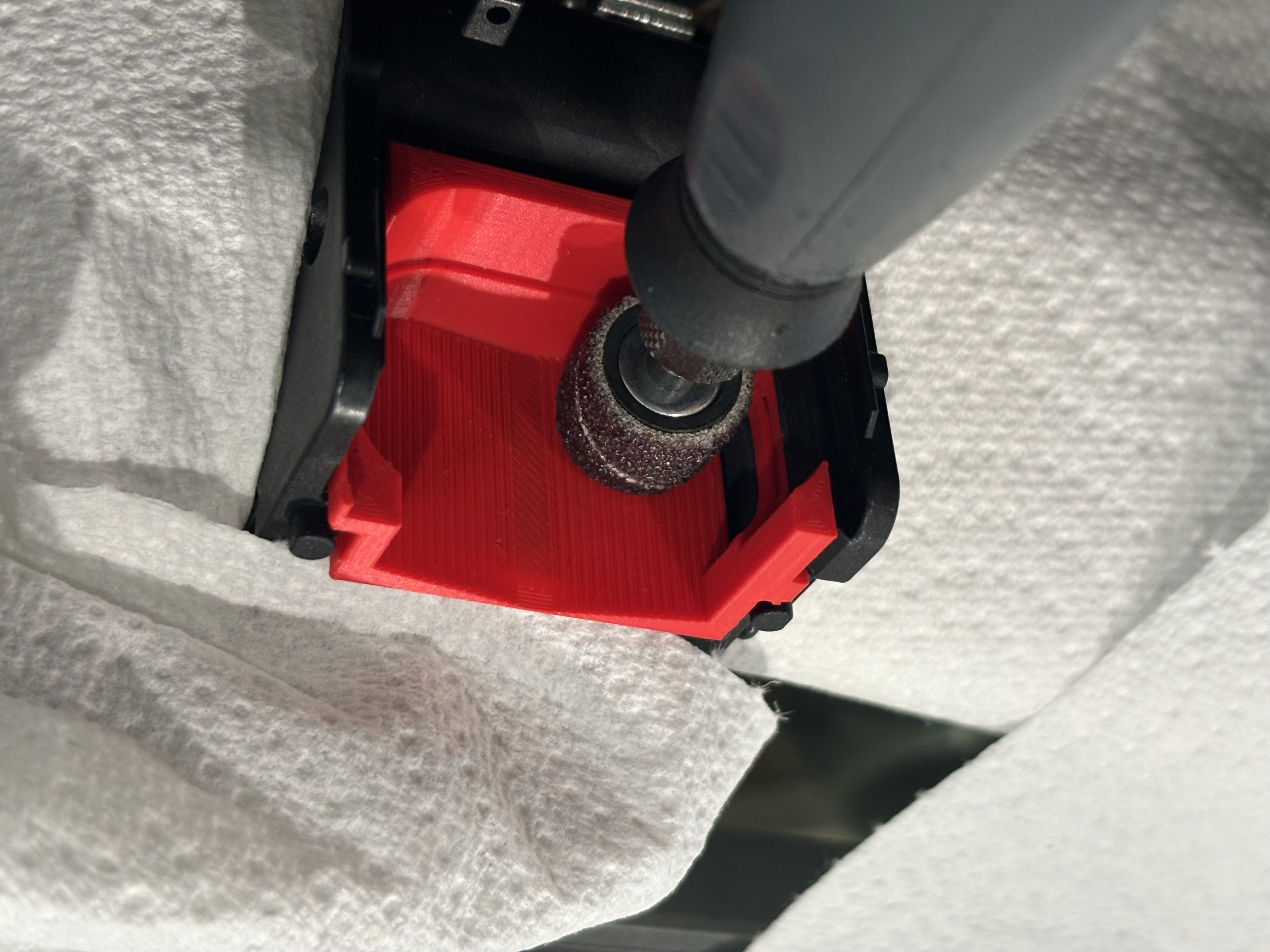 Xe đầu in K1 ở dạng gốc có bốn gân cản trở bánh răng của bộ đùn LGX, ngăn bộ đùn này lắp vừa. Do đó, cần phải mài bỏ 1mm vật liệu từ các phần của các gân này để tạo không gian cho bộ đùn LGX lắp vừa. Vì thân xe đầu in được thiết kế quá mức để tăng cường độ ở khu vực này, việc loại bỏ một lượng nhỏ vật liệu khỏi các gân này ít hoặc không ảnh hưởng đến độ bền của xe. Vì vậy, việc cắt tỉa có thể được thực hiện với sự tự tin rằng nó sẽ không ảnh hưởng đến độ tin cậy. Một dụng cụ cắt tỉa in 3D được sử dụng để ngăn chặn việc loại bỏ quá nhiều vật liệu.