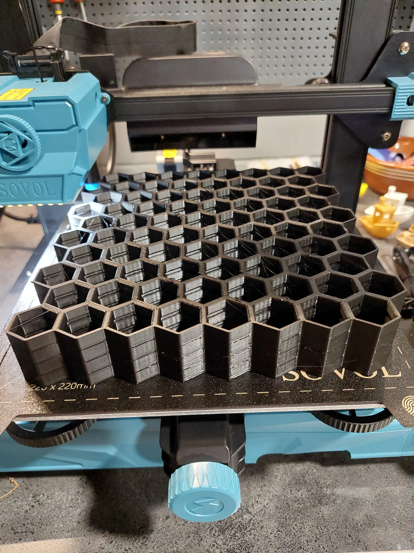 Khối lưới tổ ong lưu trữ 211x201, có thể in thành từng khối. Hướng dẫn in chi tiết, bật "ironing" và các mẹo xử lý khi bị dính. Tối ưu cho máy in 3D Sovol SV07 với tốc độ cao.