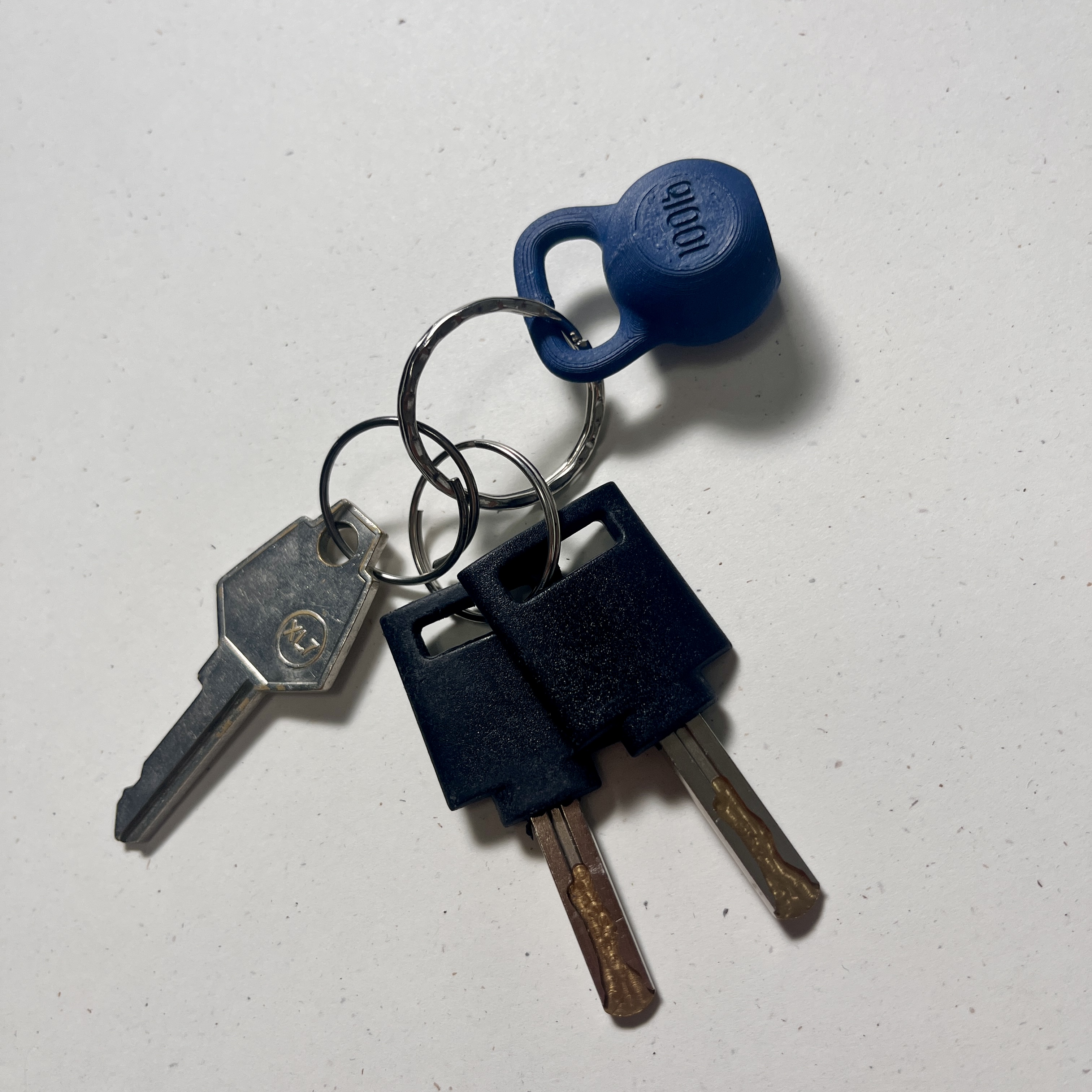 Tui có thiết kế một cái móc khóa tạ ấm với khắc chữ "100lb" lên đó. Tui thấy thiết kế này chụp lại được vẻ ngoài của một cái tạ ấm cổ điển ở một dạng nhỏ gọn, vui vẻ.