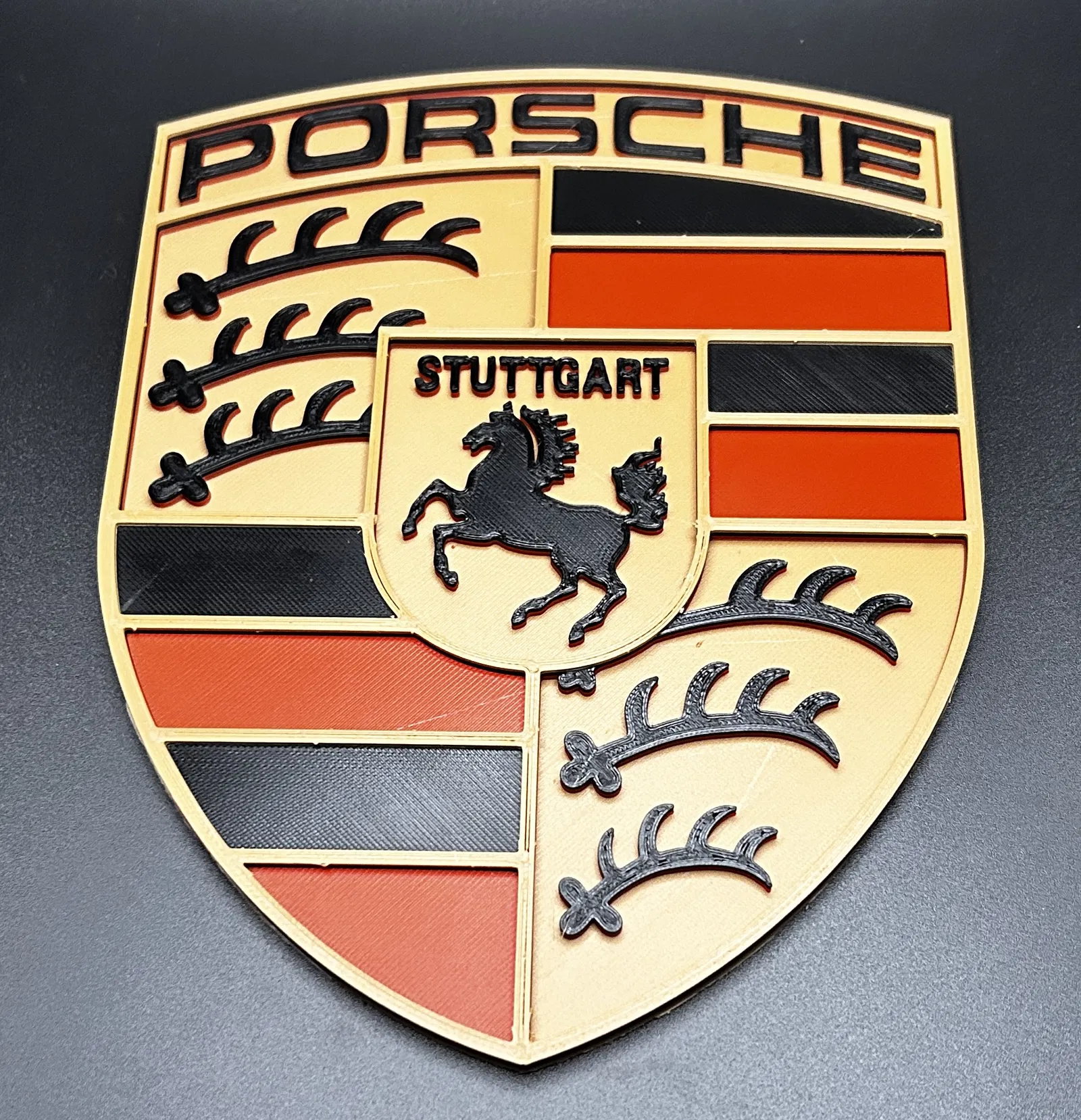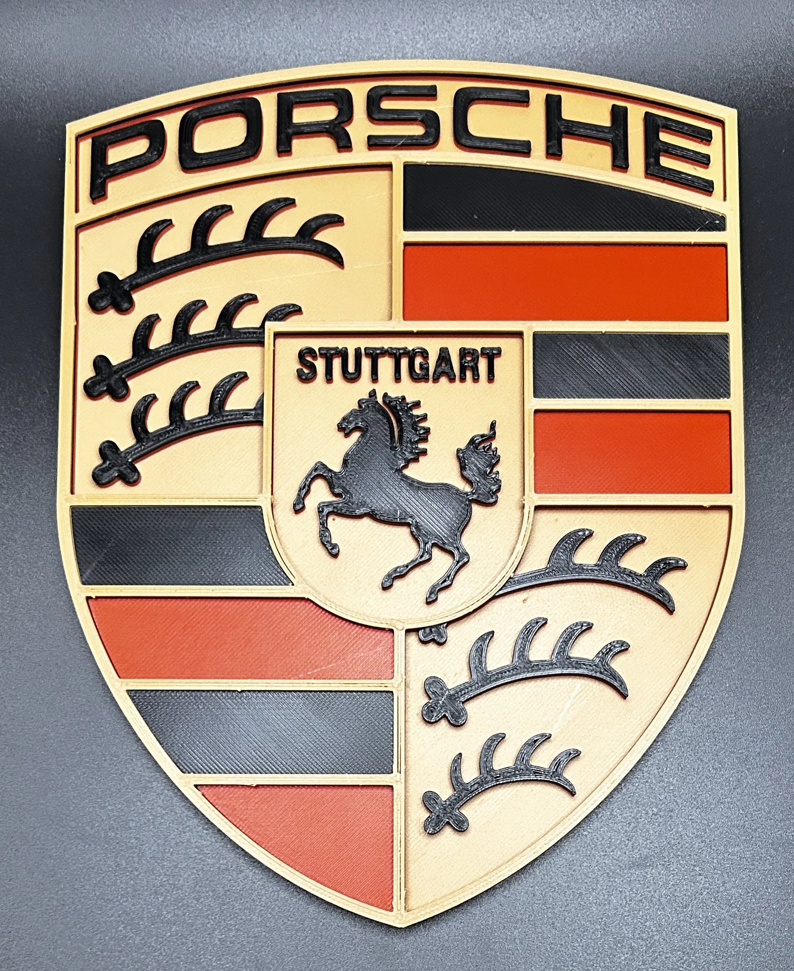 Logo xe hơi Đức nổi tiếng. Mẫu này có hướng dẫn đổi màu sợi nhựa chi tiết ở các lớp khác nhau, từ vàng kim sang đỏ, đen rồi lại vàng kim, rất phù hợp để in logo Porsche với nhiều màu sắc sinh động.