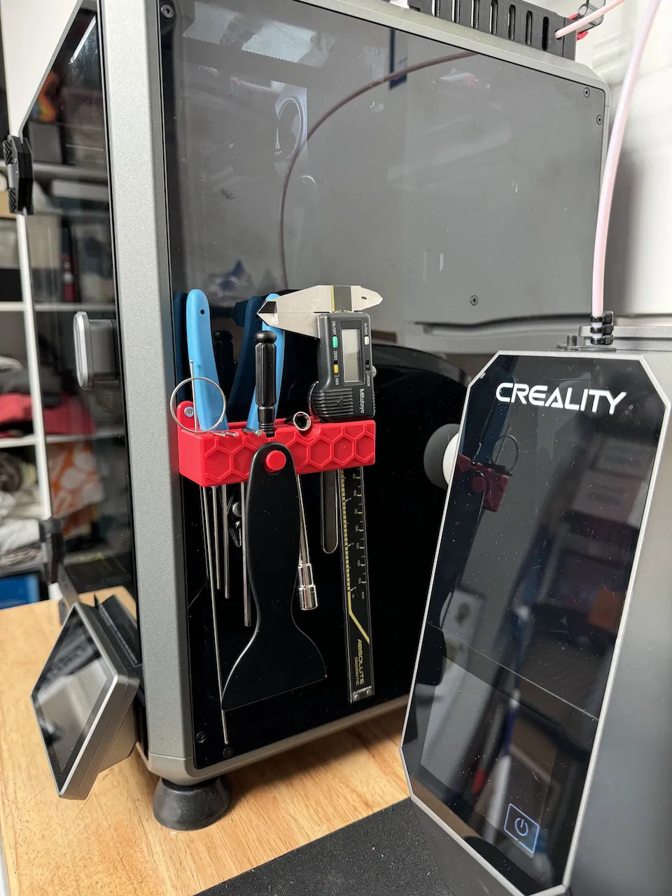 Kệ đựng đồ nghề nhỏ gọn, thiết kế riêng cho bộ đồ nghề đi kèm máy in Creality K1C. Giúp bạn sắp xếp các dụng cụ như chìa khóa lục giác, cây thông kim, dao cạo, tua vít và thước kẹp một cách gọn gàng, tránh vướng víu với phụ kiện khác.