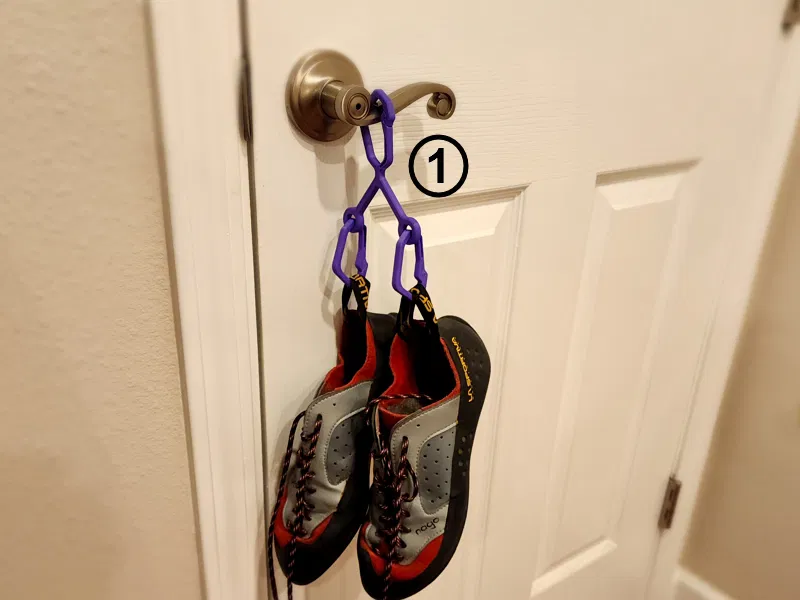 Dụng cụ mang giày leo núi #0174, được thiết kế cho giày leo núi gọn gàng, có 3 tùy chọn gắn kết. Tích hợp carabiner, có thể gắn vào đai leo núi hoặc ba lô. Hoàn hảo để giữ giày leo núi hoặc giày trẻ em của bạn gọn gàng và dễ dàng mang theo.