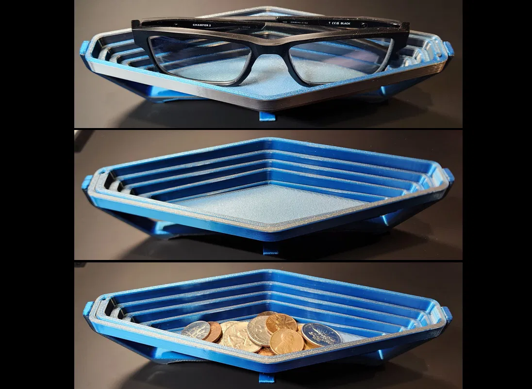 Mẫu khay võng gấp gọn độc đáo này có thể dùng đựng tiền lẻ, kính mắt, trang sức hoặc làm hũ đựng tiền tip. Tính năng chính là lò xo lồng vào nhau, có thể khóa bằng ma sát, và chân đế in liền. Có 3 phiên bản để lựa chọn, phù hợp với nhiều nhu cầu và vật liệu in khác nhau. Lưu ý khi in để tránh làm hỏng các khớp nối.