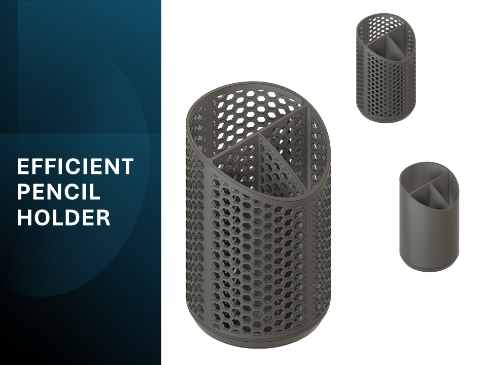 Kệ đựng bút được tối ưu hóa để nhẹ nhàng. Có 3 mẫu: tổ ong, chỉ viền tổ ong và không có tổ ong. Giảm chi phí vật liệu nhưng có thể tăng thời gian in tùy mẫu.