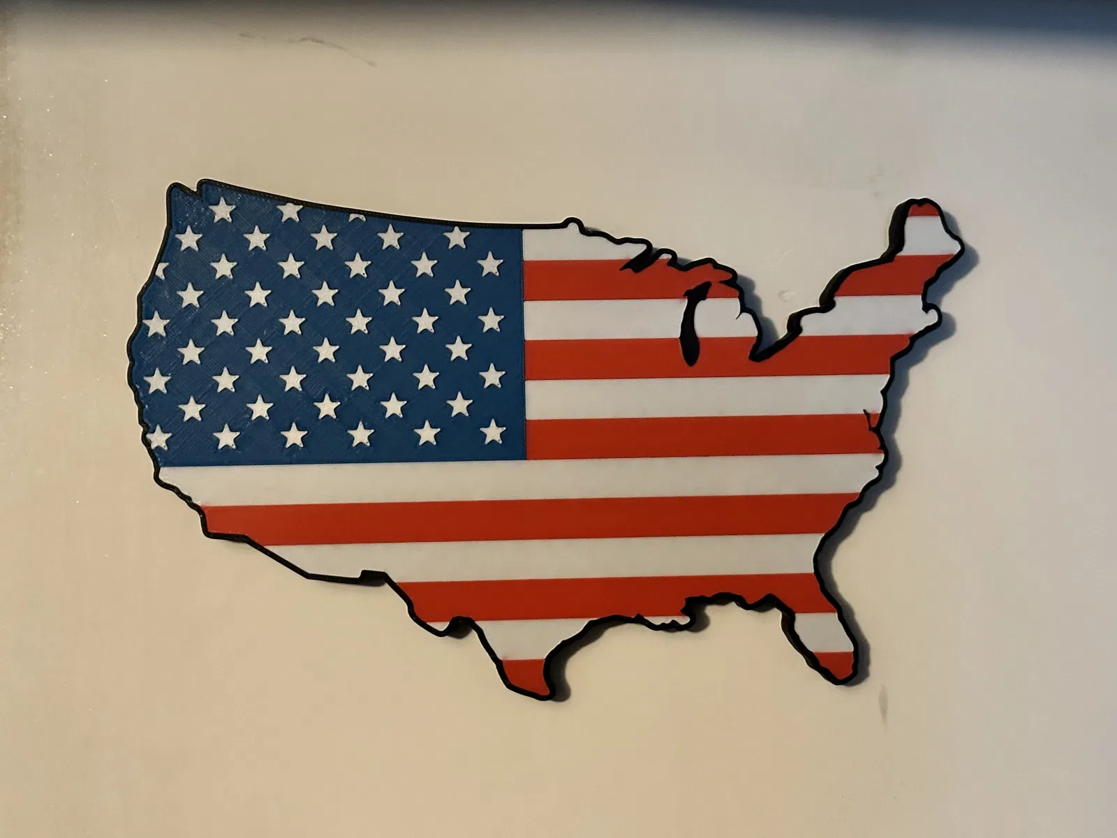 In đa sắc lá cờ Mỹ nằm gọn trong hình cắt của Hoa Kỳ. Sản phẩm này hoàn hảo để in với máy 4 màu như Bambu AMS, có ba kích cỡ khác nhau và hai lỗ treo tường tiện lợi.