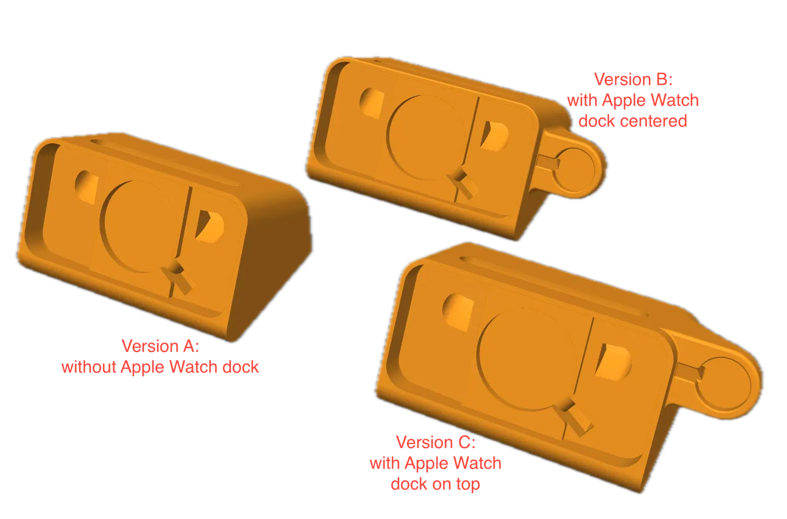 Đế sạc cho iPhone 15, 15 Pro (có hoặc không có ốp lưng) và Apple Watch tùy chọn. Có các phiên bản V1, V2, V3 với kích thước khác nhau để phù hợp với các mẫu iPhone và ốp lưng. Có các tùy chọn đặt Apple Watch ở giữa hoặc phía trên.