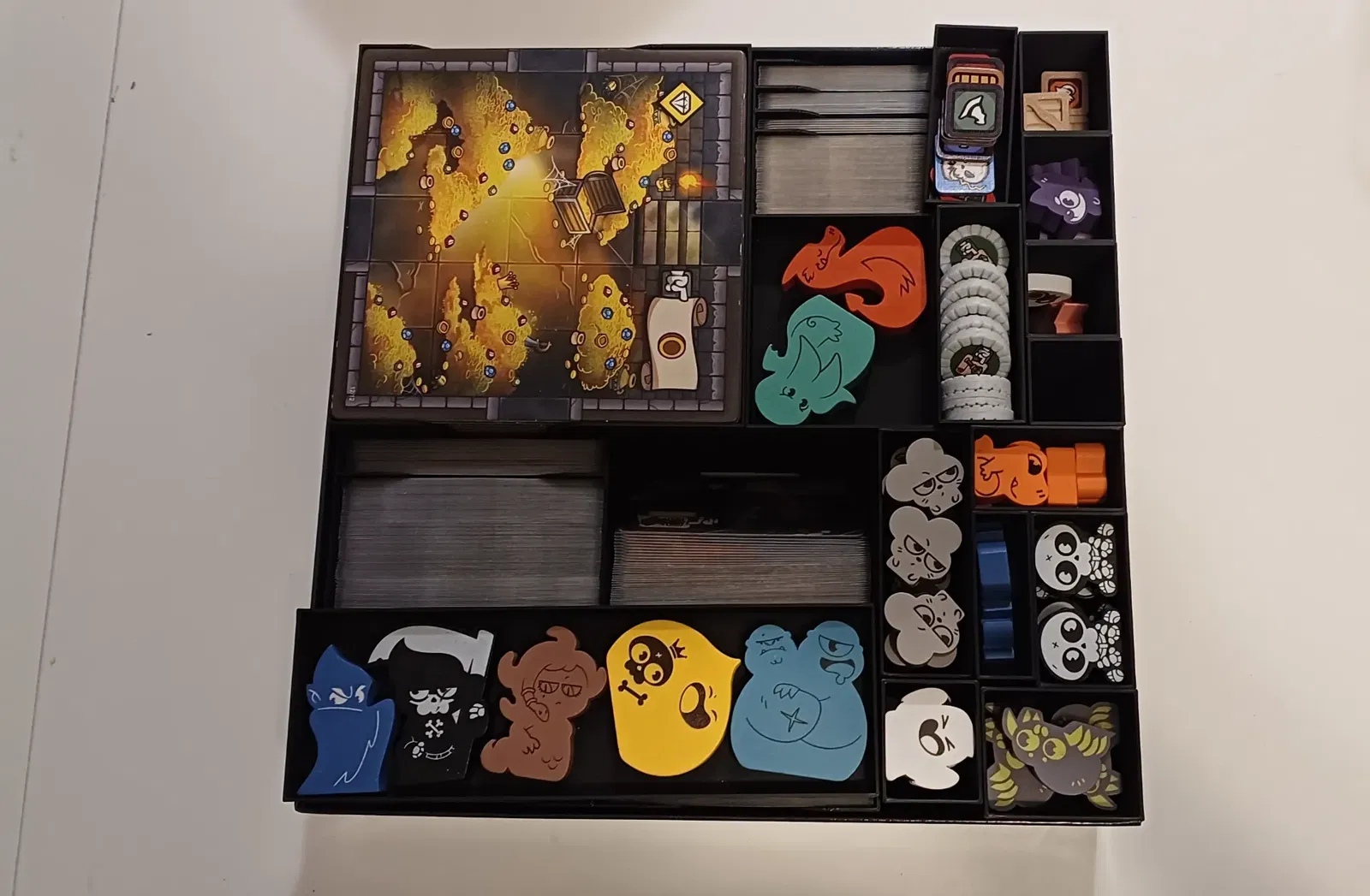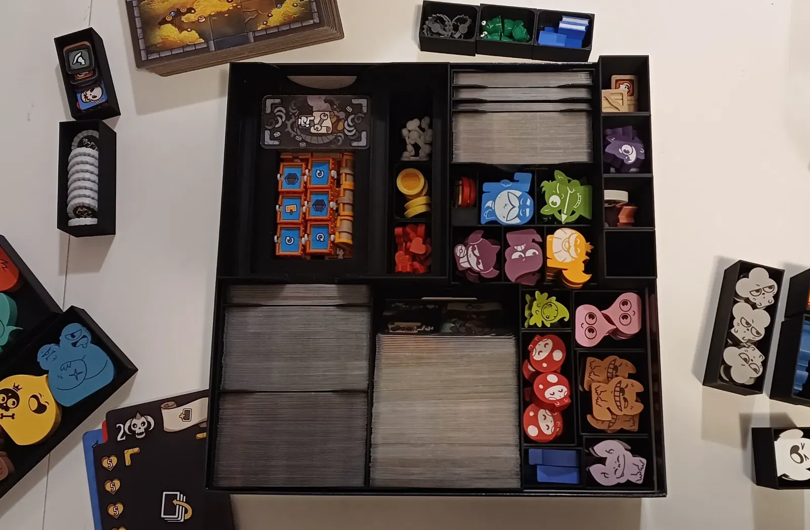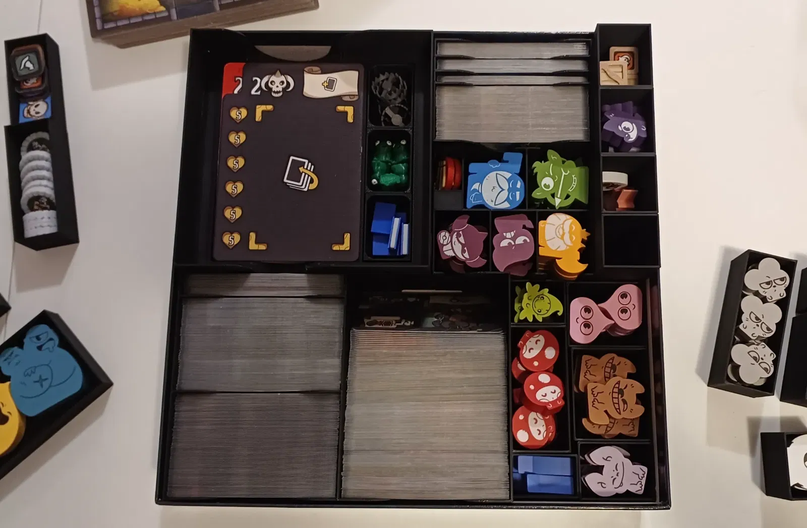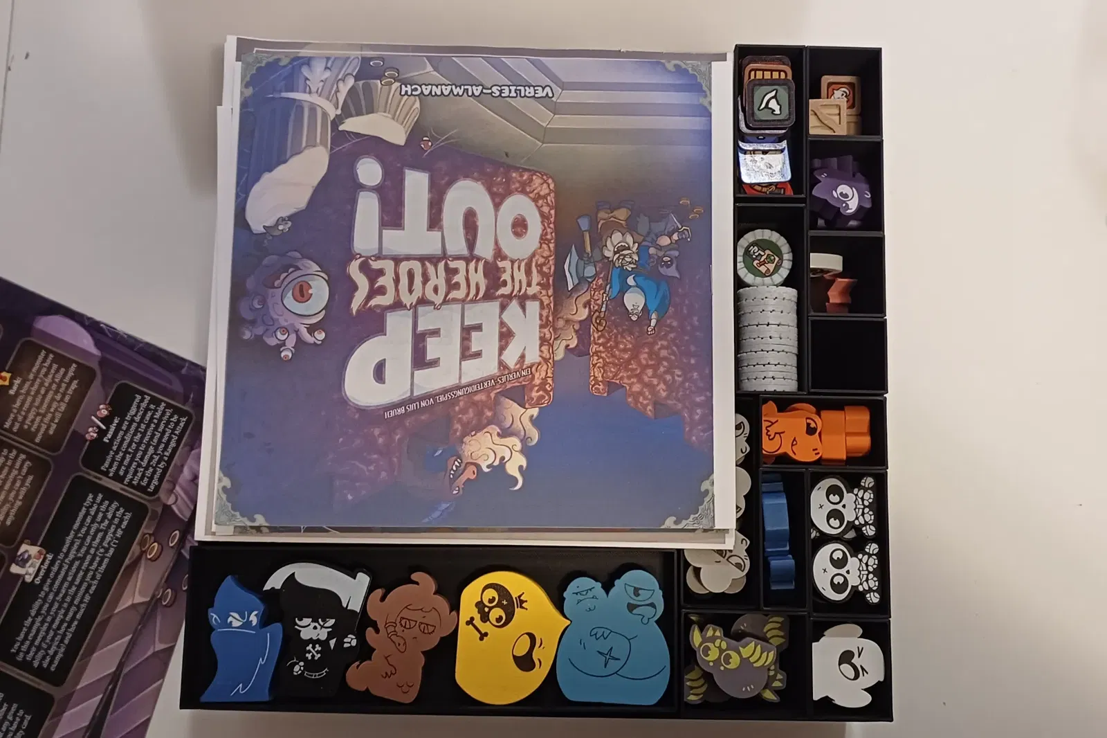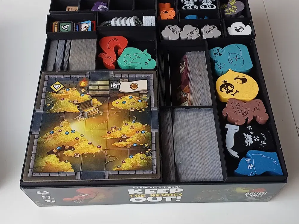 Đây là bản Insert tui làm cho Keep the Heroes Out. Nó có thể chứa tất cả mọi thứ vào một hộp duy nhất, bao gồm cả nội dung mở rộng, bộ Token nâng cấp của tui, các lá bài đã được bọc sleeve, và cả bản in (trên giấy A4) của sách hướng dẫn (của tui là tiếng Đức) bên cạnh sách gốc.