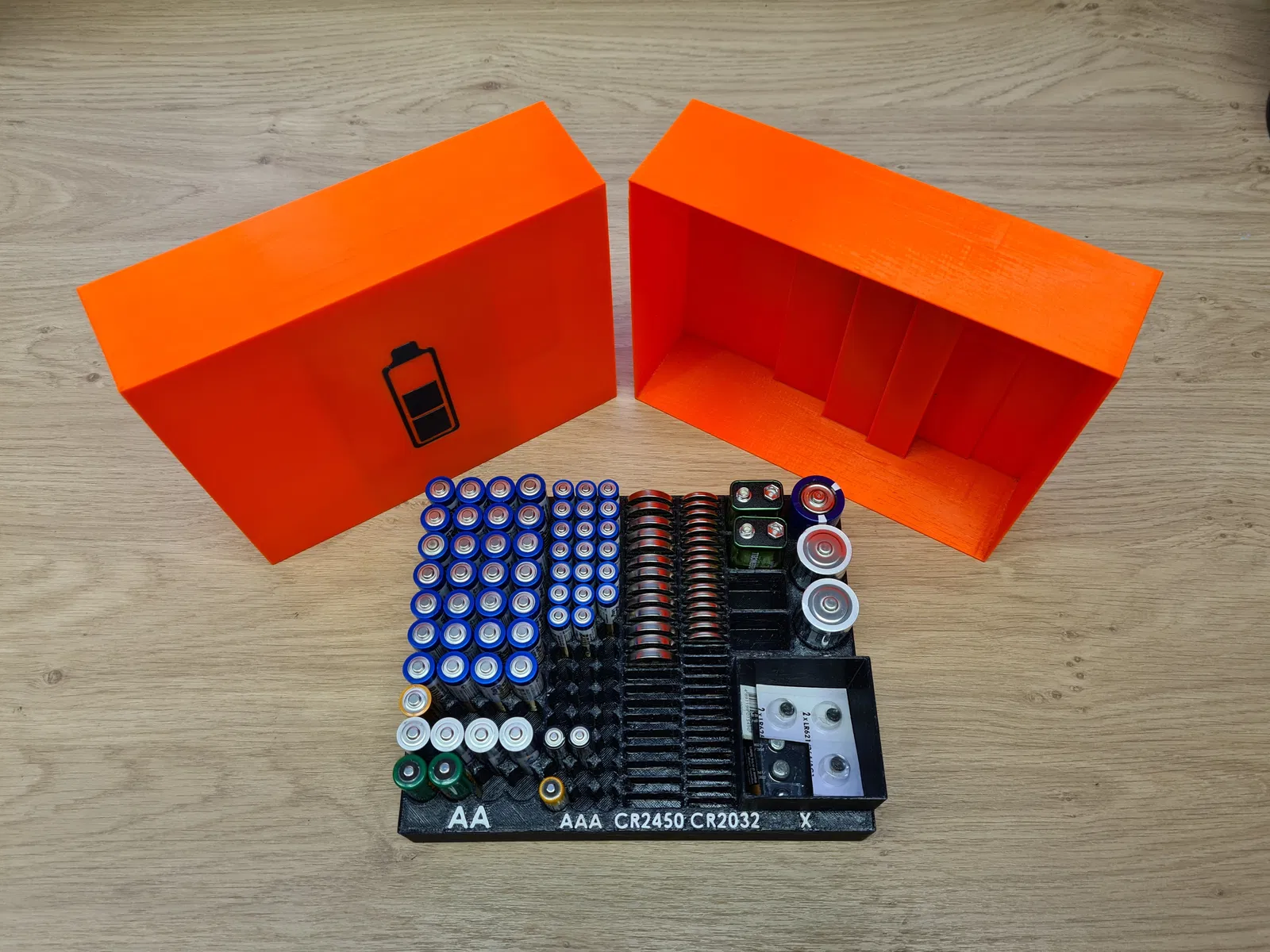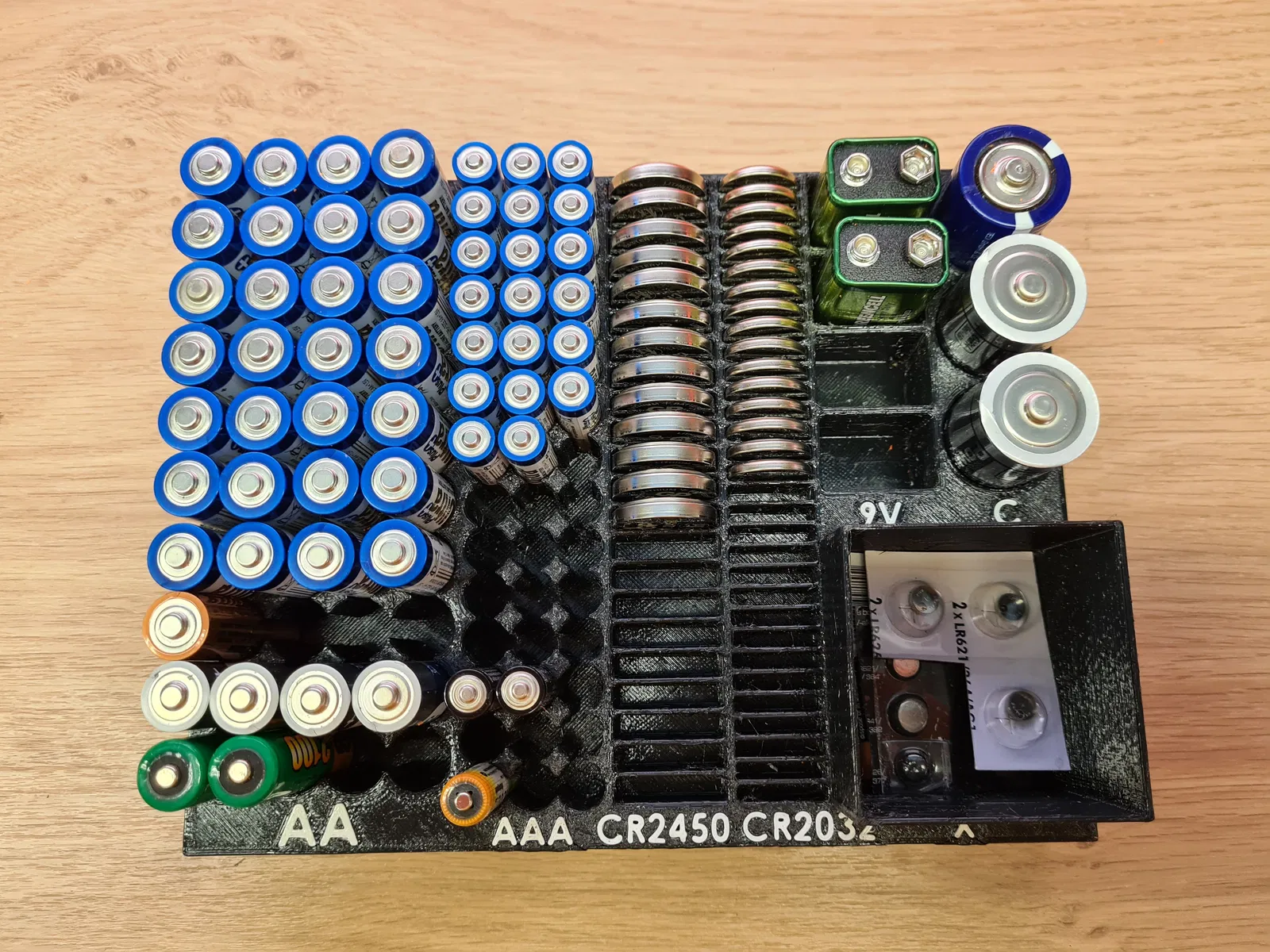 Hộp đựng pin với sức chứa lớn, có thể chứa 30xAA, 42xAAA, 22xCR2450, 31xCR2032, 3xC, 4x9V và thêm pin dự phòng. Hộp có nắp đậy, pin được cố định chắc chắn, tha hồ rung lắc không sợ rơi rớt.