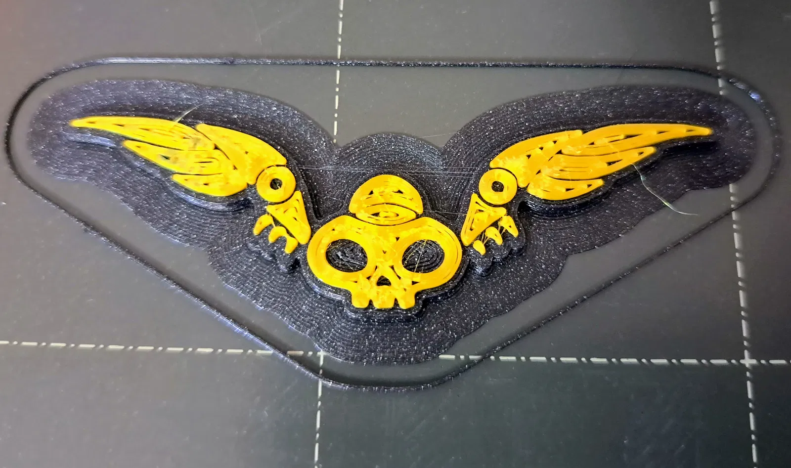 In hai màu, Prusament Galaxy Black với Prusament Oh My Gold ở trên. In bằng đầu phun 0.4mm. Kết quả khá tốt, mặc dù in kích thước lớn hơn hoặc dùng đầu phun nhỏ hơn sẽ cho bề mặt trên đẹp hơn.