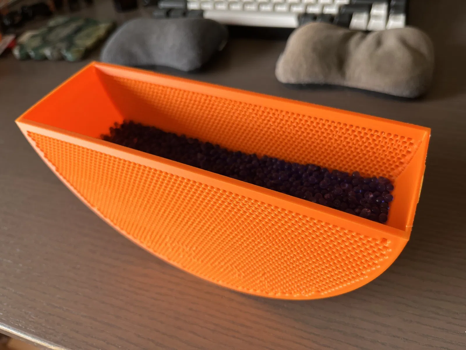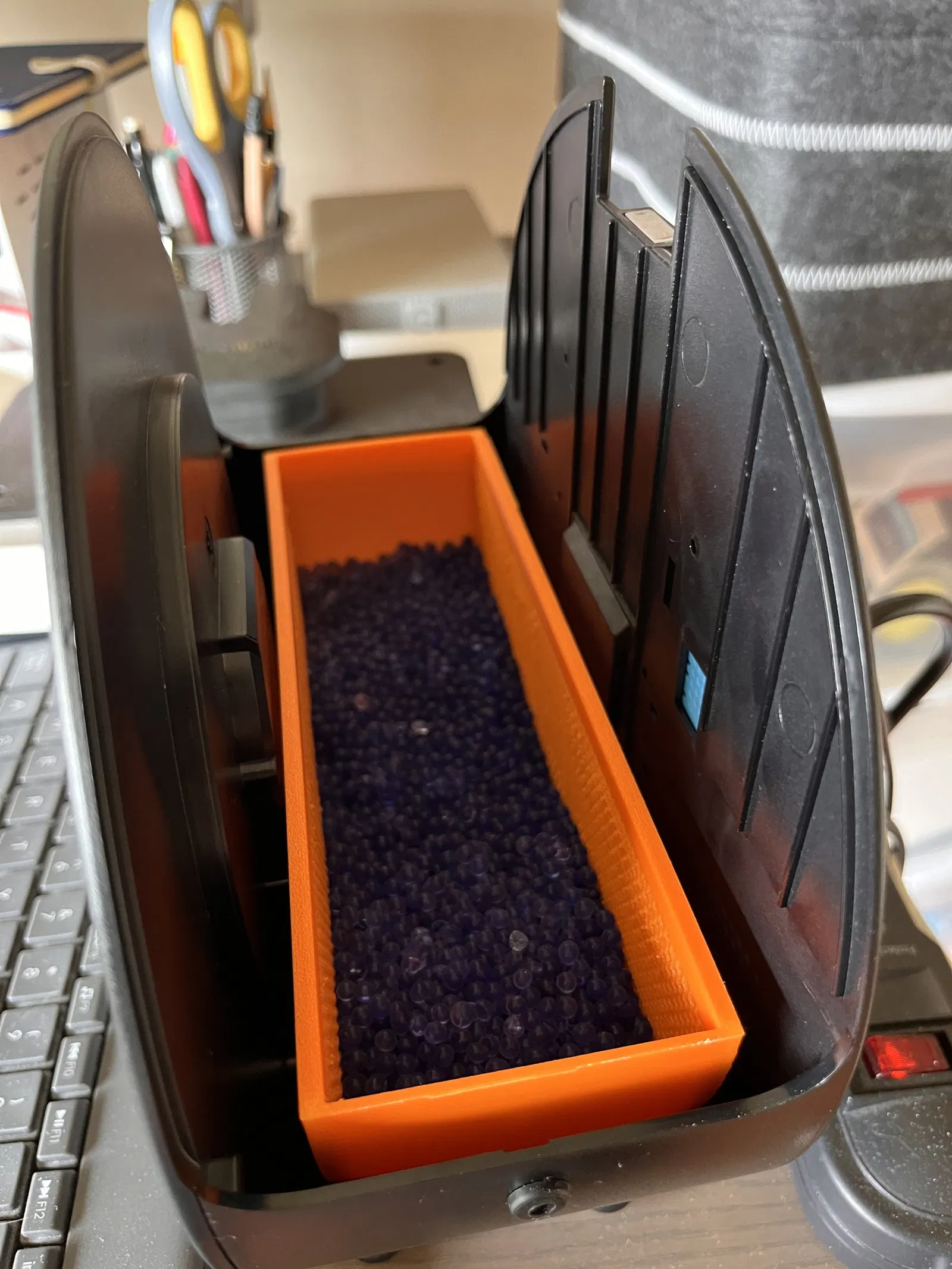 I created this model so that I could dry my desiccant with my filament dryer. I have designed with the dimensions of a Bambu Lab filament spool. It's measurements are approx: 20cm X 10cm X 5.8cm (LxWxD). It can hold about 700g of desiccant. Hoạt động tuyệt vời trên máy sấy Filment Filent của tôi. I printed this in ABS on my BambuLab P1S with the rectangular face down, supports at 45 degree threshold, with a 10mm brim.